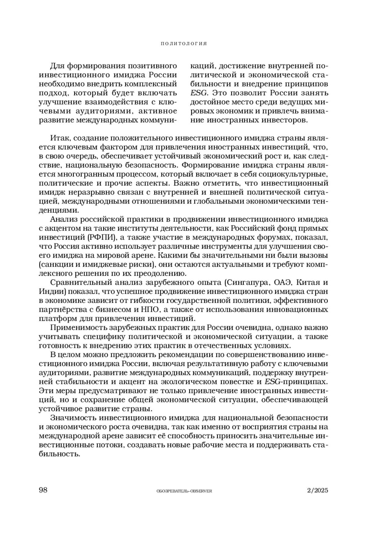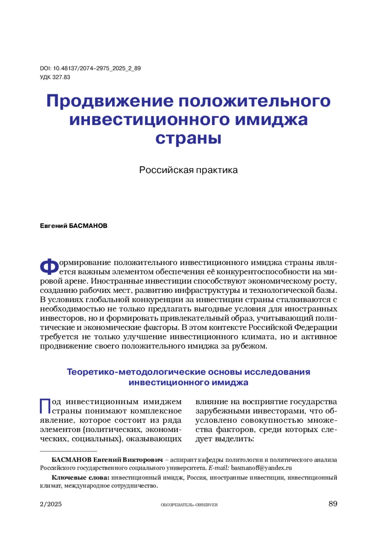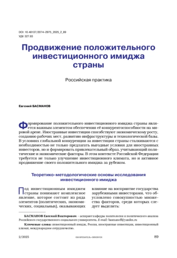 Автор рассматривает теоретические основы формирования инвестиционного имиджа страны на основе анализа российской практики, показывает ключевые аспекты и инструменты продвижения России как привлекательного направления для иностранных инвестиций, включая роль государственной политики, международных форумов и стратегий цифрового продвижения; анализирует успешные примеры из других стран (Сингапура, ОАЭ, США и Китая). В статье даются рекомендации по улучшению инвестиционного имиджа России.