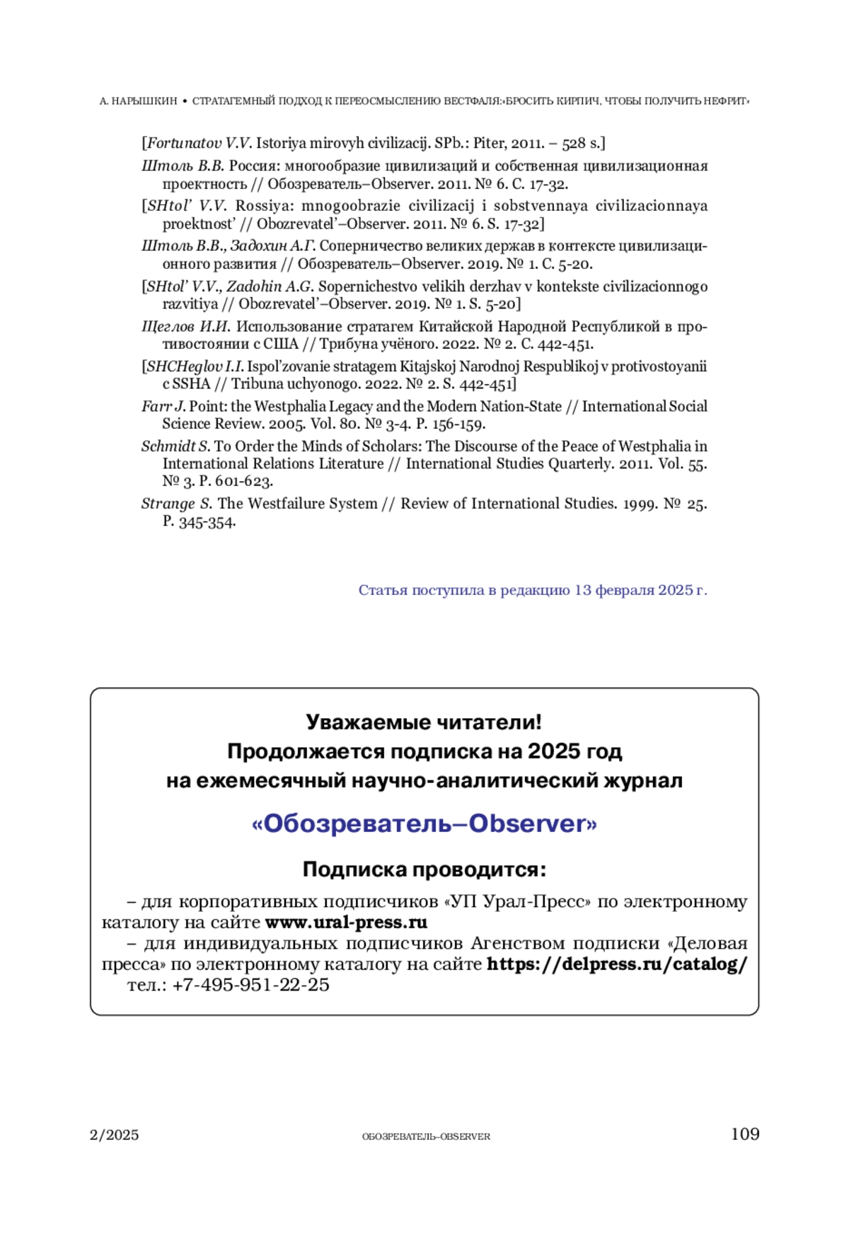 17. Штоль В.В., Задохин А.Г. Соперничество великих держав в контексте цивилизационного развития // Обозреватель-Observer. 2019. № 1. С. 5-20.