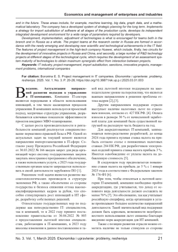 Актуализация совершенствования подходов к управлению IT-компаниями связана с государственной задачей по развитию высокотехнологических производств в структуре экономики РФ, а также с задачей по снижению оттока высококвалифицированных кадров за рубеж. IT-компании являются передовыми в области использования инноваций, в том числе касающихся процессов управления. В компаниях используется проектный подход, матричные структуры управления, разрабатываются ключевые показатели эффективности проектов, внедряют MBO-планирование. Одной из передовых компаний на рынке информационных технологий является корпорация Huawei, имеющая с своей структуре центр разработки и развития компетенций в г. Новосибирске. Корпорация не размещает акции на фондовом рынке, поэтому не возникает необходимости перенаправлять часть прибыли на выплату дивидендов, что расширяет возможности компании в области инвестиций в долгосрочные проекты. К особенностям проектного менеджмента в корпорации Huawei относятся, во-первых, два контура разработки инновационных проектов в России и в КНР, во-вторых, большое количество НИОКР-проектов технологий, находящихся на разных стадиях технологического цикла, что требует разработки системы оценки зрелости технологий для получения максимального синергетического эффекта от взаимодействия внутри проектов.