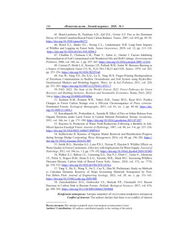 56. Walker X.J., Baltzer J.L., Cumming S.G., Day N.J., Ebert C., Goetz S., Johnstone J.F., Potter S., Rogers B.M., Shuur E.A.G., Turetsky M.R., Mack M.C. Increasing Wildfires Threaten Historic Carbon Sink of Boreal Forest Soils. Nature, 2019, vol. 572, no. 7770, pp. 520-523. DOI: 10.1038/s41586-019-1474-y EDN: GXIXVX