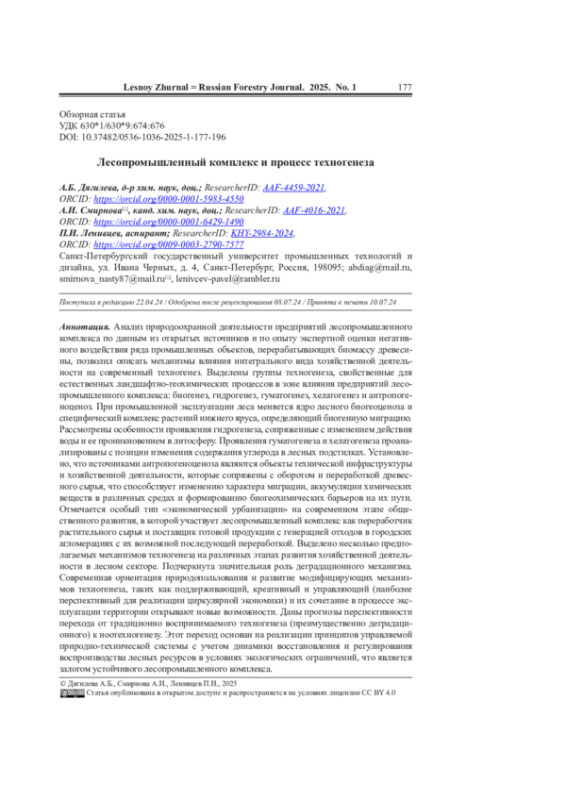Анализ природоохранной деятельности предприятий лесопромышленного комплекса по данным из открытых источников и по опыту экспертной оценки негативного воздействия ряда промышленных объектов, перерабатывающих биомассу древесины, позволил описать механизмы влияния интегрального вида хозяйственной деятельности на современный техногенез. Выделены группы техногенеза, свойственные для естественных ландшафтно-геохимических процессов в зоне влияния предприятий лесопромышленного комплекса: биогенез, гидрогенез, гуматогенез, хелатогенез и антропогеноценоз. При промышленной эксплуатации леса меняется ядро лесного биогеоценоза и специфический комплекс растений нижнего яруса, определяющий биогенную миграцию. Рассмотрены особенности проявления гидрогенеза, сопряженные с изменением действия воды и ее проникновением в литосферу. Проявления гуматогенеза и хелатогенеза проанализированы с позиции изменения содержания углерода в лесных подстилках. Установлено, что источниками антропогеноценоза являются объекты технической инфраструктуры и хозяйственной деятельности, которые сопряжены с оборотом и переработкой древесного сырья, что способствует изменению характера миграции, аккумуляции химических веществ в различных средах и формированию биогеохимических барьеров на их пути. Отмечается особый тип «экономической урбанизации» на современном этапе общественного развития, в которой участвует лесопромышленный комплекс как переработчик растительного сырья и поставщик готовой продукции с генерацией отходов в городских агломерациях с их возможной последующей переработкой. Выделено несколько предполагаемых механизмов техногенеза на различных этапах развития хозяйственной деятельности в лесном секторе. Подчеркнута значительная роль деградационного механизма. Современная ориентация природопользования и развитие модифицирующих механизмов техногенеза, таких как поддерживающий, креативный и управляющий (наиболее перспективный для реализации циркулярной экономики) и их сочетание в процессе эксплуатации территории открывают новые возможности. Даны прогнозы перспективности перехода от традиционно воспринимаемого техногенеза (преимущественно деградационного) к ноотехногенезу. Этот переход основан на реализации принципов управляемой природно-технической системы с учетом динамики восстановления и регулирования воспроизводства лесных ресурсов в условиях экологических ограничений, что является залогом устойчивого лесопромышленного комплекса.