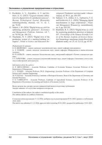 11. Речкалов А. В., Артюхов А. В., Куликов Г. Г. Логико-семантическое определение цифрового двойника производственного процесса // Russian Technological Journal. - 2023. - Т. 11, № 1. - С. 70-80. EDN: ERLTTE