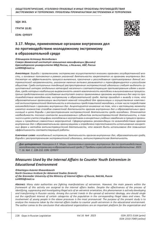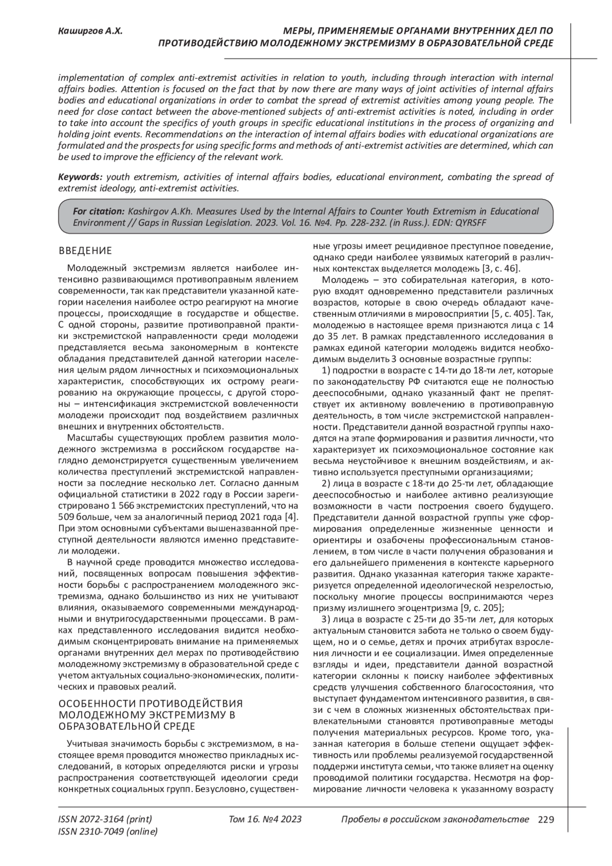 Kashirgov A.Kh., Semenov E.A. On the issue of characteristics of extremism in the youth environment // Eurasian legal journal. 2022. No. 7 (170). pp. 405-406. EDN: JROSXP