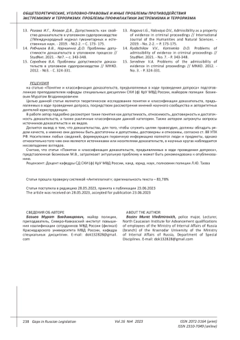 14. Рябчиков В.В., Корниенко Д.О. Проблемы допустимости доказательств в уголовном процессе // StudNet. 2021. - №7. - с. 343-348. EDN: OSFLOH