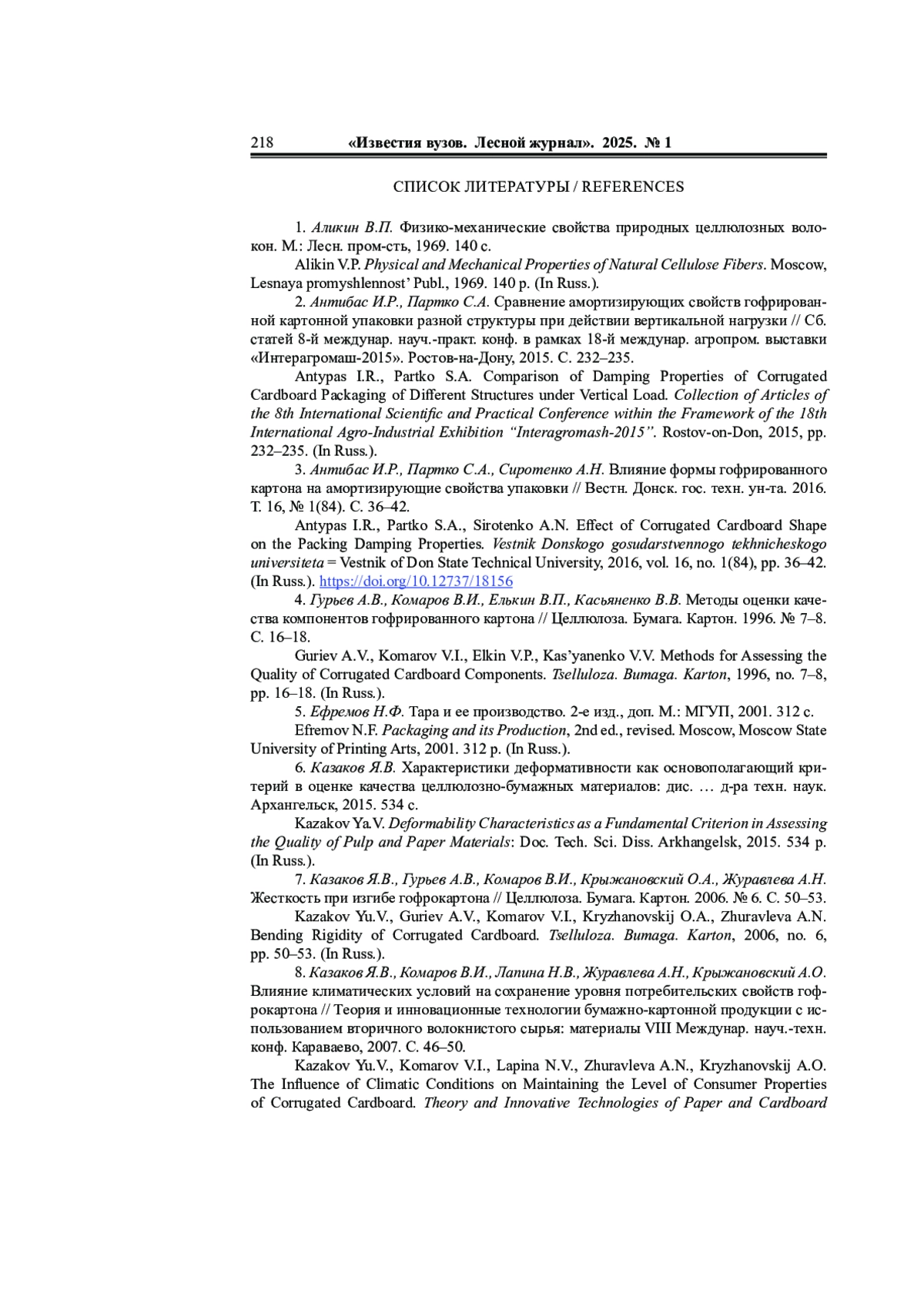 4. Гурьев А.В., Комаров В.И., Елькин В.П., Касьяненко В.В. Методы оценки качества компонентов гофрированного картона // Целлюлоза. Бумага. Картон. 1996. No 7-8. С. 16-18.