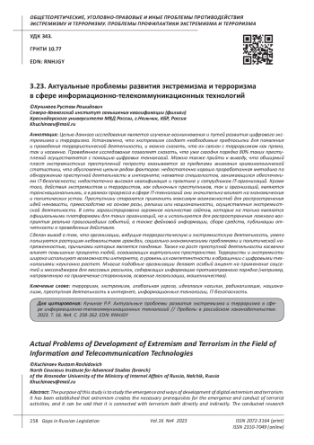 Актуальность исследования современного состояния экстремизма и терроризма с учетом достигнутого ими уровня развития объясняется тем, что цифровые и IT-технологии переживают фазу стремительного прогресса, в результате которого преступники могут активнее пользоваться этими достижениями с целью более эффективной и широкой деятельности. Целью данного исследования является определение цифрового экстремизма и терроризма, возникновение которых обусловлено детерминирующейся к настоящему времени сложной криминологической ситуацией, появлением новых угроз со стороны криминального мира и новых видов преступлений. Возникновение и развитие данных явлений во многом является следствием неразрешенных конфликтов в обществе, назревания остроты противоречий в разных областях социальной и государственной деятельности. Задачи исследования состоят в обосновании путей совершенствования противодействия цифровому экстремизму и терроризму. Установлено, что организации, ведущие деятельность, носящую террористический и/или экстремистский характер, развиваются тем активнее, чем больше людей становится пользователями мессенджеров и соцсетей. Такие программы как WhatsApp, Viber, Telegram, платформы Facebook, Instagram, Twitter и многие другие интенсивно используются преступниками в противозаконных целях. С их помощью они могут куда эффективнее регулировать свою деятельность, привлекать новых сторонников, вести финансовые сборы, публиковать различного рода материалы, нацеленные на привлечение внимания, агитацию террористической и экстремистской деятельности. Благодаря современным соцсетям и мессенджерам преступники формируют автономные ячейки, набирают активистов, собирают средства на осуществление актов, направленных на нанесение вреда отдельным гражданам, структурам и целому государству. Сделан вывод о том, что формирование новых видов указанных преступлений подразумевает рост необходимости пересмотра и модернизации стратегических и тактических решений в области борьбы с ними, что должно осуществляться не только на уровне конкретной страны, но и в международном сообществе в целом.