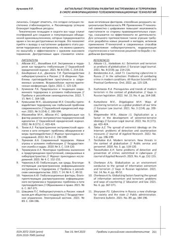 10. Черкесов А.Ю. Глобализационные факторы, благоприятствующие распространению информационного экстремизма и терроризма: проблемы и пути противодействия // Образование и право. 2021. № 6. С. 367-371. EDN: ANNIPS