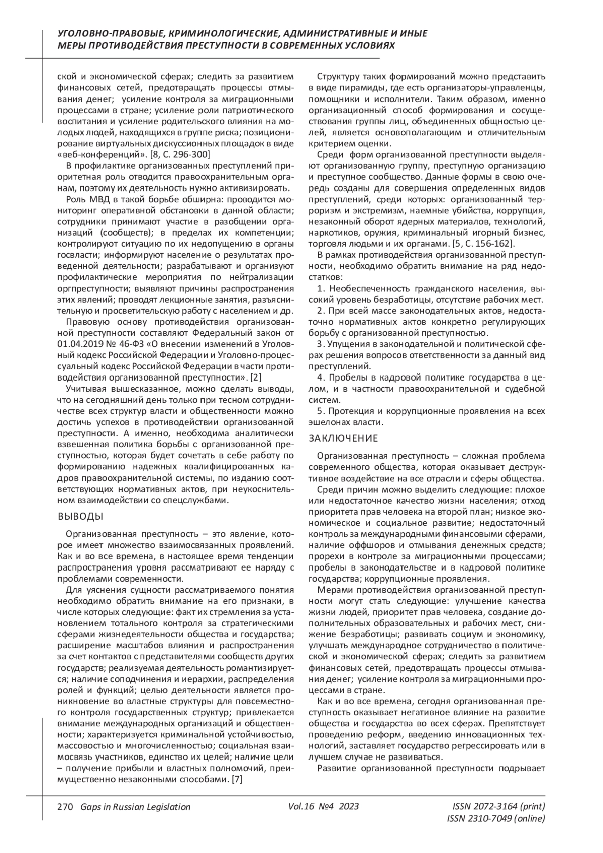 6. Корсаков К.В. Криминологический и уголовно-правовой анализ современной организованной преступности // Научный ежегодник Института философии и права Уральского отделения Российской академии наук. - 2017. - Том 17. - Выпуск 3. - С. 67-84. EDN: ZOLDIN