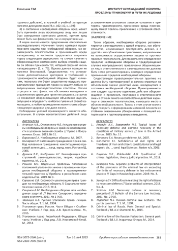 5. Решняк М.Г. Отдельные проблемы толкования положений уголовного закона о превышении пределов необходимой обороны в правоприменительной практике // Пробелы в российском законодательстве. 2019. № 3. EDN: SBBJWQ