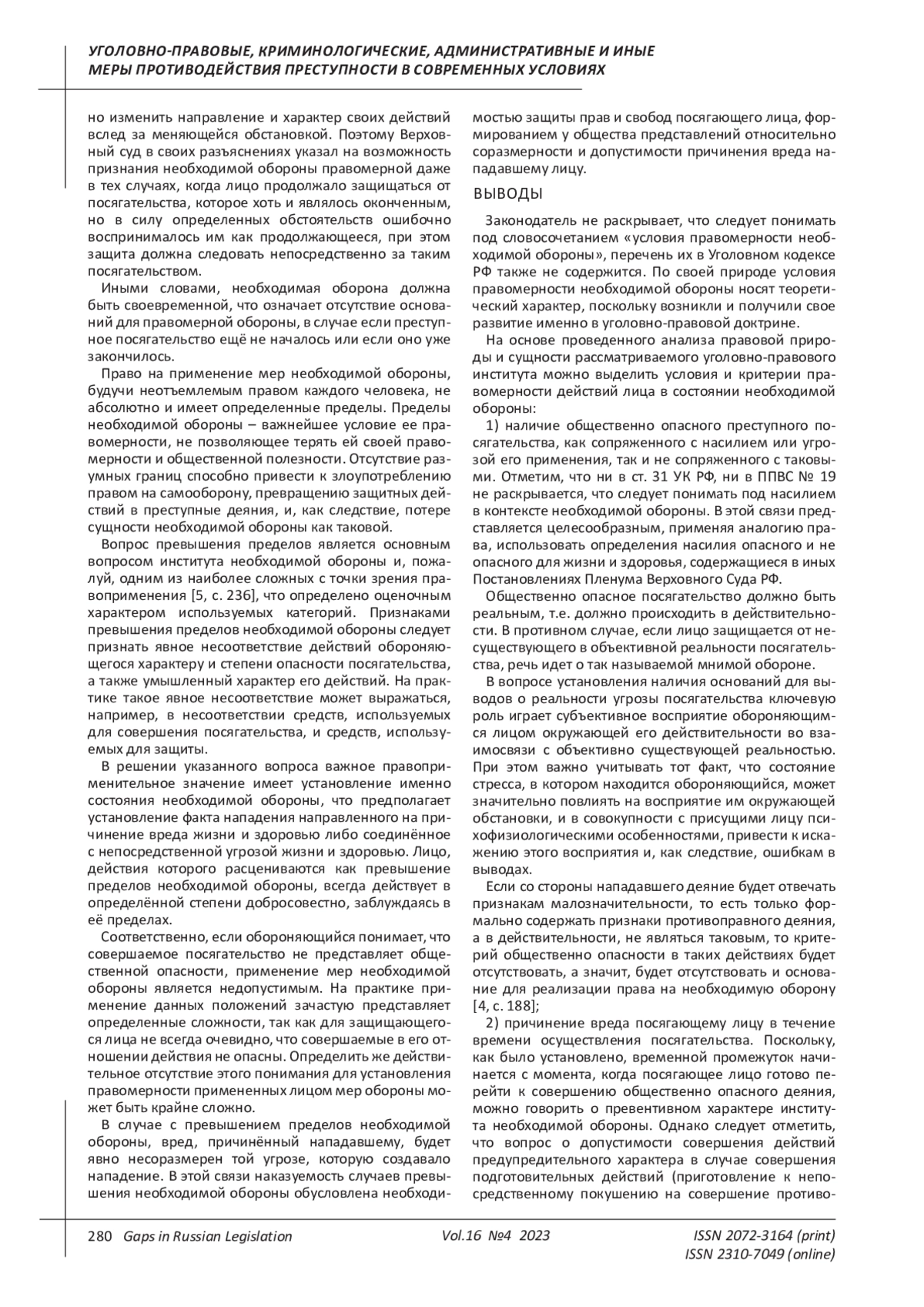 6. Серегина Е.В. Сложности реализации права граждан на необходимую оборону // Социально-политические науки. 2018. № 4. EDN: UYXNBZ