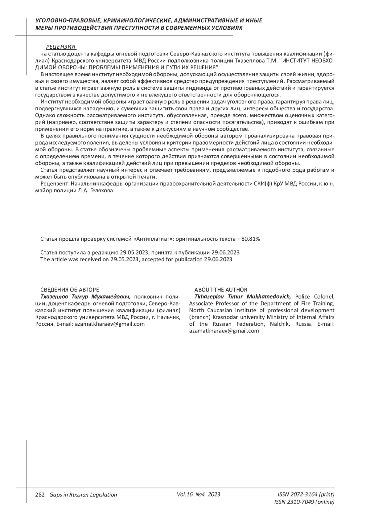 7. Смирнов А.М. Необходимая оборона или необходимая защита? // Вестник Самарского юридического института. 2021. № 2 (43). EDN: DBCEGV
