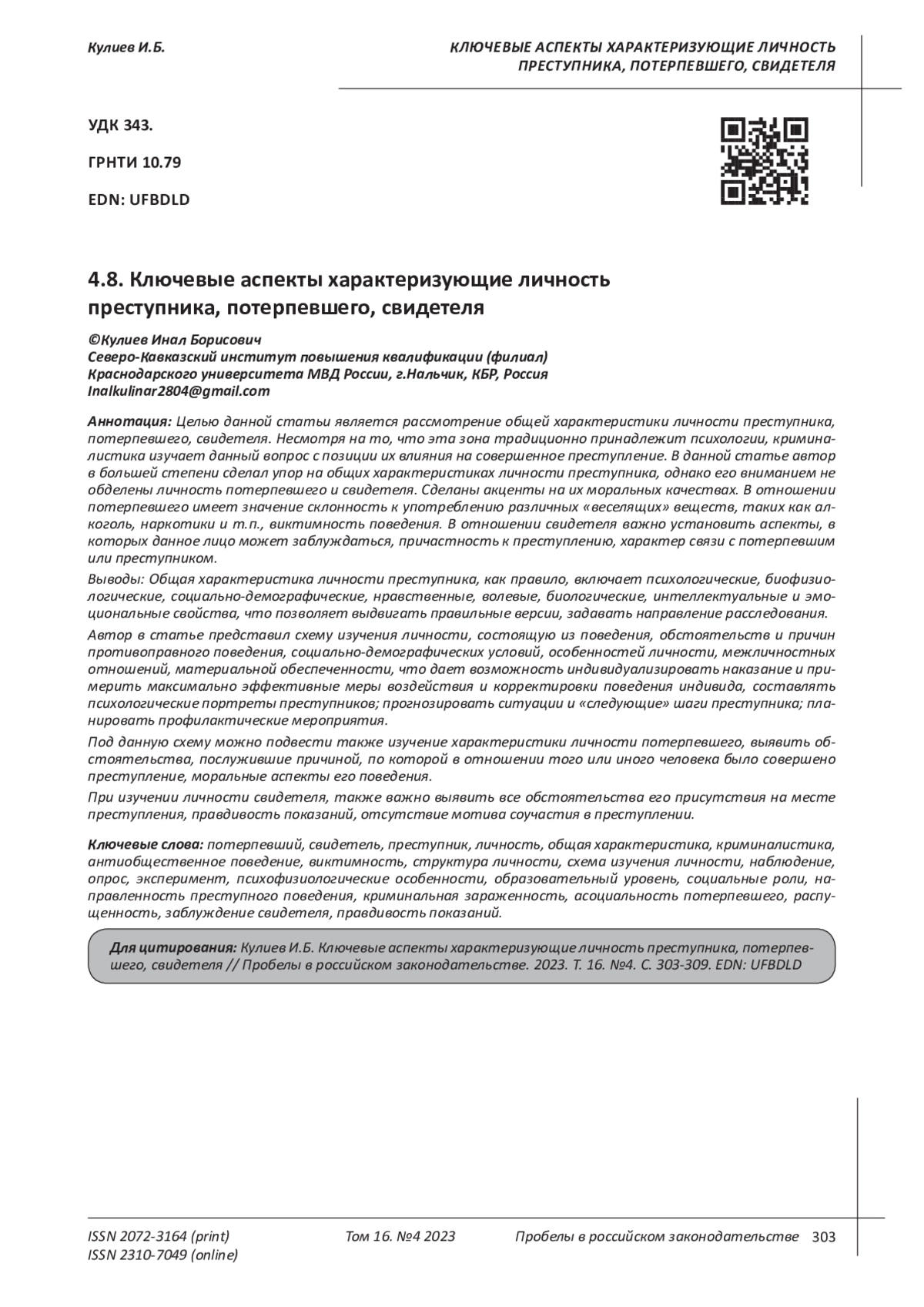 Ignatov A.N. Socio-demographic and criminal-legal characteristics of the personality of a modern violent criminal // Criminology: yesterday, today, tomorrow. Journal of the St. Petersburg International Criminological Club. - 2015. - No. 4 (39). - P. 93-98.