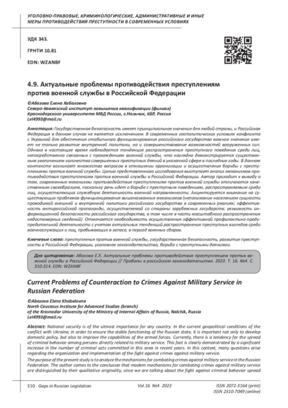 Государственная безопасность имеет принципиальное значение для любой страны, и Российская Федерация в данном случае не является исключением. В современных геополитических условиях конфликта с Украиной для обеспечения стабильного функционирования российского государства важное значение имеет не только развитие внутренней политики, но и совершенствование возможностей вооруженных сил. Однако в настоящее время наблюдается тенденция распространения преступного поведения среди лиц, непосредственно связанных с прохождением военной службы, что наглядно демонстрируется существенным увеличением количества совершенных преступных деяний в указанной сфере в последние годы. В данном контексте возникает множество вопросов в отношении организации и осуществления борьбы с преступлениями против военной службы. Целью представленного исследования выступает анализ механизмов противодействия преступлениям против военной службы в Российской Федерации. Автор приходит к выводу о том, современные механизмы противодействия преступлениям против военной службы отличаются качественным своеобразием, поскольку речь идет о борьбе с преступным поведением, распространяемым среди лиц, осуществляющих служебную деятельность военной направленности. Акцентируется внимание на существующих проблемах функционирования вышеназванных механизмов (непонимание населением сущности проводимой внешней и внутренней политики российского государства в современных реалиях; эффективность антироссийской пропаганды, осуществляемой со стороны зарубежных государств; уязвимость информационной безопасности российского государства, в том числе в части масштабного распространения недостоверных сведений). Отмечается необходимость осуществления эффективной профилактико-предупредительной деятельности с учетом актуальных тенденций распространения преступных взглядов среди военнослужащих и лиц, пребывающих в запасе, в период военных сборов.