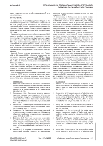 1. Алешин С.В. Обеспечение принципа законности в деятельности подразделений патрульно-постовой службы полиции //Общественная безопасность, законность и правопорядок в III тысячелетии. 2019. № 5. С. 7-9. EDN: TFQIAO