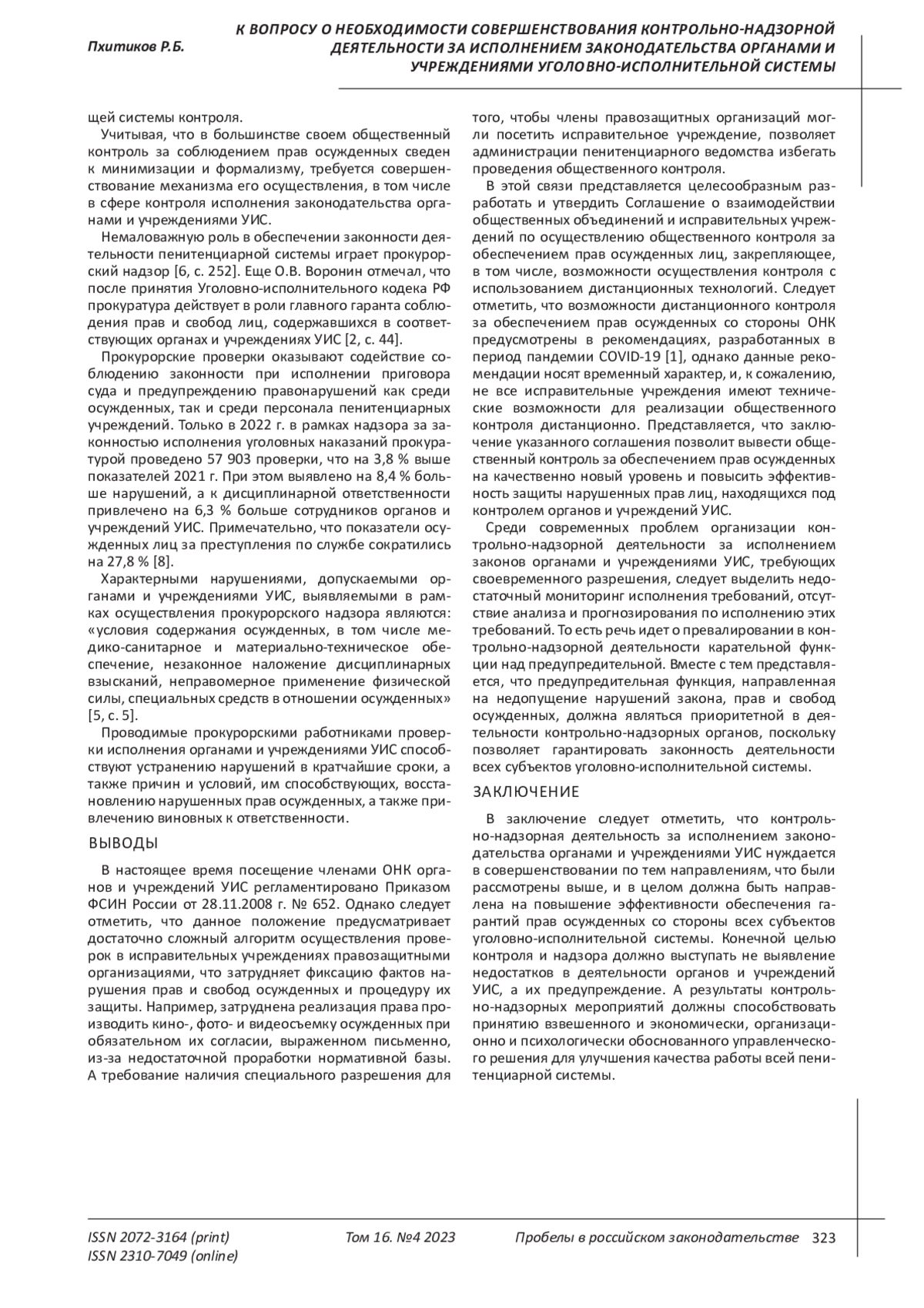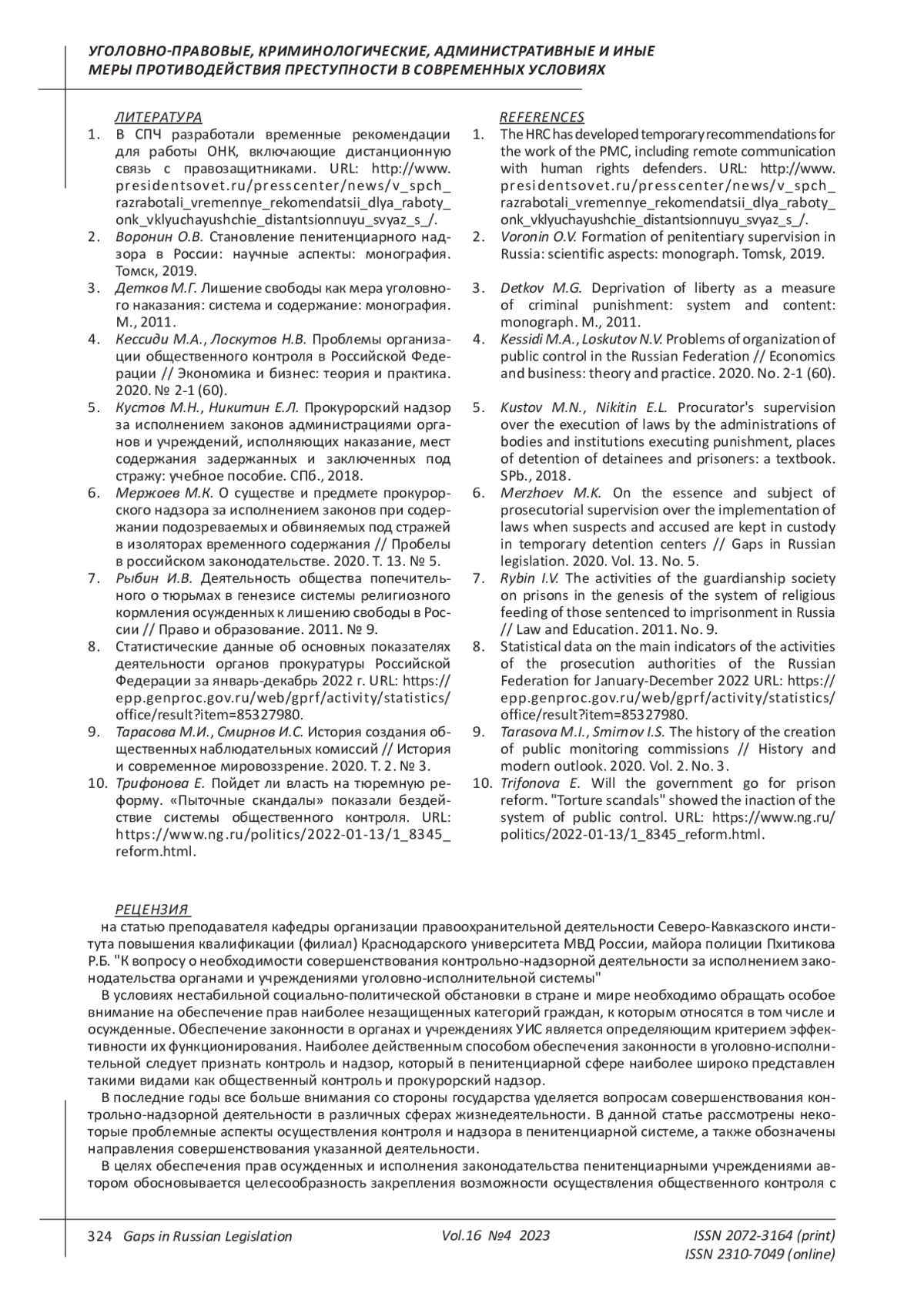 9. Тарасова М.И., Смирнов И.С. История создания общественных наблюдательных комиссий // История и современное мировоззрение. 2020. Т. 2. № 3. EDN: IGWHOR