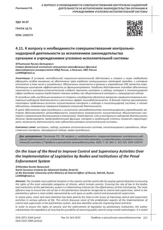 В условиях нестабильной социально-политической обстановки в стране и мире необходимо обращать особое внимание на обеспечение прав наиболее незащищенных категорий граждан, к которым относятся в том числе и осужденные. Обеспечение законности в органах и учреждениях УИС является определяющим критерием эффективности их функционирования. Наиболее действенным способом обеспечения законности в уголовно-исполнительной следует признать контроль и надзор, который в пенитенциарной сфере наиболее широко представлен такими видами как общественный контроль и прокурорский надзор. В последние годы все больше внимания со стороны государства уделяется вопросам совершенствования контрольно-надзорной деятельности в различных сферах жизнедеятельности. В данной статье рассмотрены некоторые проблемные аспекты осуществления контроля и надзора в пенитенциарной системе, а также обозначены направления совершенствования указанной деятельности. В целях обеспечения прав осужденных и исполнения законодательства пенитенциарными учреждениями автором обосновывается целесообразность закрепления возможности осуществления общественного контроля с применением дистанционных технологий. Отмечается, что в контрольно-надзорной деятельности должна превалировать предупредительная функция, которая в наибольшей степени позволит гарантировать законность деятельности всех субъектов уголовно-исполнительной системы.