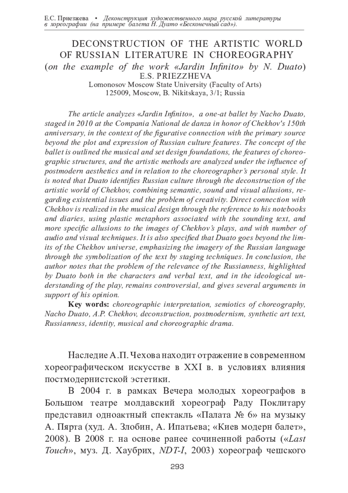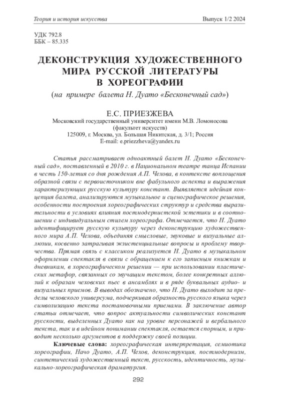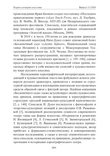 Статья рассматривает одноактный балет Н. Дуато «Бесконечный сад», поставленный в 2010 г. в Национальном театре танца Испании в честь 150-летия со дня рождения А. П. Чехова, в контексте воплощения образной связи с первоисточником вне фабульного аспекта и выражения характеризующих русскую культуру констант. Выявляется идейная концепция балета, анализируются музыкальное и сценографическое решения, особенности построения хореографических структур и средства выразительности в условиях влияния постмодернистской эстетики и в соотношении с индивидуальным стилем хореографа. Отмечается, что Н. Дуато идентифицирует русскую культуру через деконструкцию художественного мира А. П. Чехова, объединяя смысловые, звуковые и визуальные аллюзии, косвенно затрагивая экзистенциальные вопросы и проблему творчества. Прямая связь с классиком реализуется Н. Дуато в музыкальном оформлении спектакля в связи с обращением к его записным книжкам и дневникам, в хореографическом решении — при использовании пластических метафор, связанных со звучащим текстом, более конкретных аллюзий к образам чеховских пьес в ансамблях и в ряде буквальных аудио- и визуальных приемов. В выводах обозначено, что Н. Дуато выходит за пределы чеховского универсума, подчеркивая образность русского языка через символизацию текста постановочными приемами. В заключение автор статьи отмечает, что вопрос актуальности символических констант русскости, выделенных Дуато как на уровне персонажей и вербального текста, так и в идейном понимании спектакля, остается спорным, и приводит несколько аргументов в поддержку своей позиции.