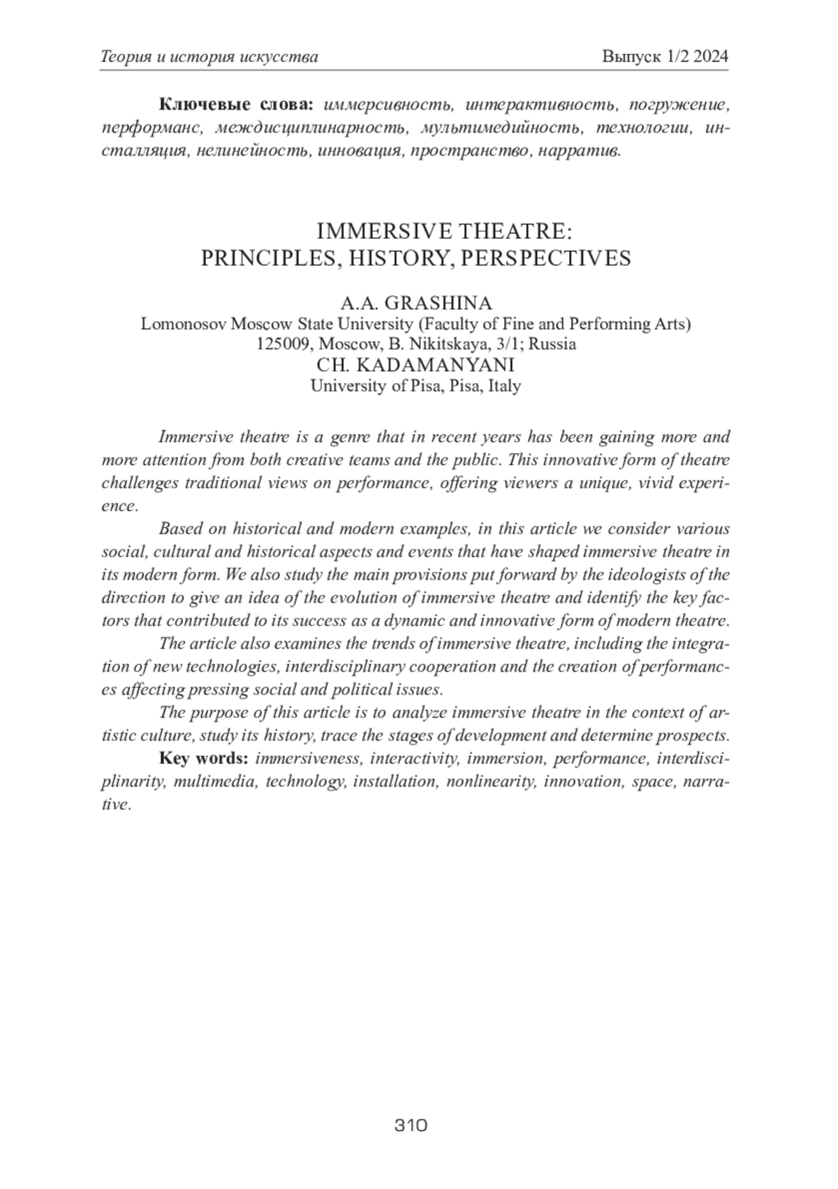 Иммерсивный театр — жанр, который в последние годы завоевывает все большее внимание как творческих коллективов, так и публики. Эта инновационная форма театра бросает вызов традиционным представлениям о спектакле, предлагая зрителям уникальные, яркие впечатления. Опираясь на исторические и современные примеры, в данной статье рассматриваются различные социальные, культурные и исторические аспекты и события, сформировавшие иммерсивный театр в современном виде. Исследуются также основные положения, выдвинутые идеологами направления. В статье дается представление об эволюции иммерсивного театра и определяются ключевые факторы, которые способствовали его успеху как динамичной и инновационной формы современного театра. В данной работе рассматриваются тенденции иммерсивного театра, в том числе интеграция новых технологий, междисциплинарное сотрудничество и создание спектаклей, затрагивающих насущные социальные и политические проблемы. Цель этой статьи — проанализировать иммерсивный театр в контексте художественной культуры, изучить его историю, проследить этапы развития и определить перспективы.