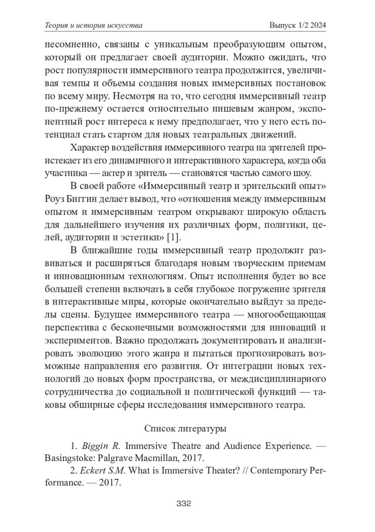 1. Biggin R. Immersive Theatre and Audience Experience. - Basingstoke: Palgrave Macmillan, 2017.