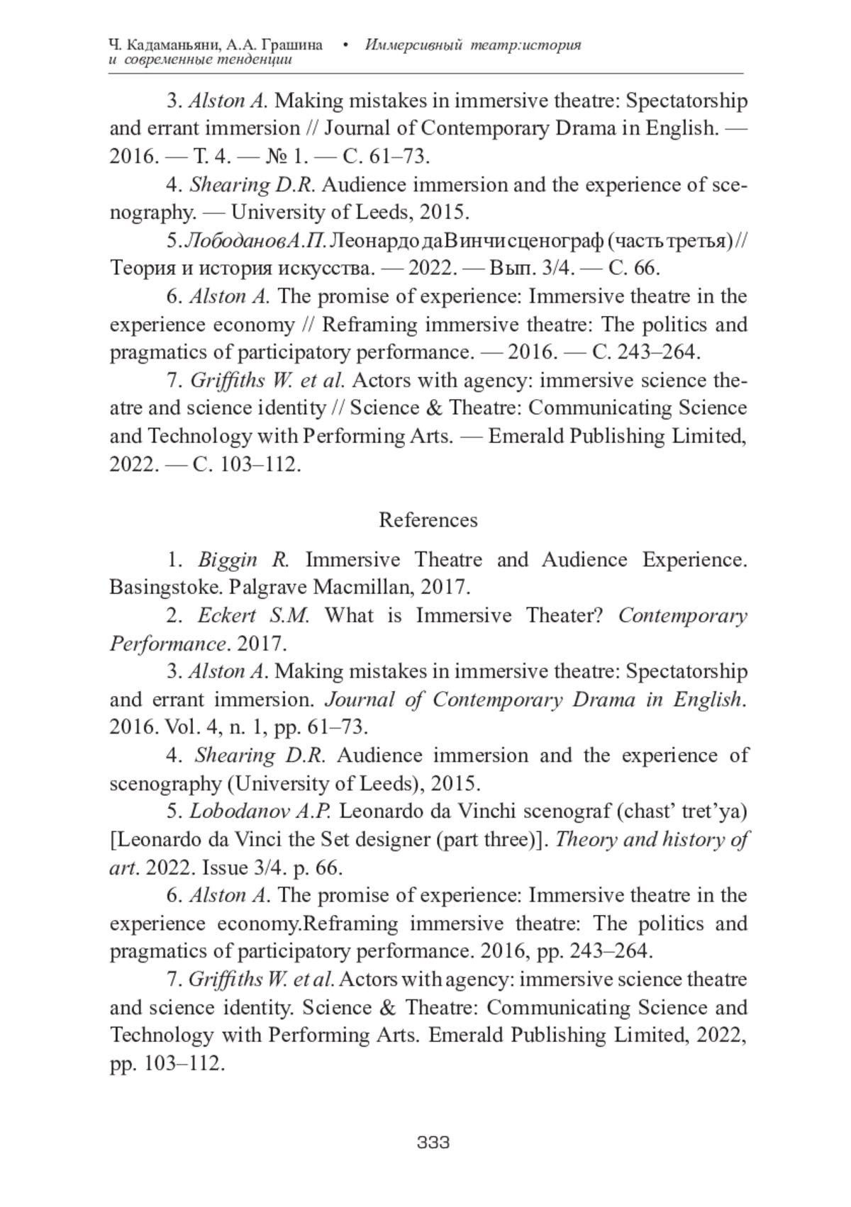 7. Griffiths W. et al. Actors with agency: immersive science theatre and science identity // Science & Theatre: Communicating Science and Technology with Performing Arts. - Emerald Publishing Limited, 2022. - С. 103-112.