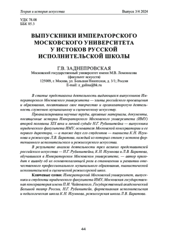 В статье представлена деятельность выдающихся выпускников Императорского Московского университета — элиты российского просвещения и образования, посвятивших свое творчество и организаторскую деятельность служению музыкальному и сценическому искусству. Проанализированы научные труды, архивные материалы, документы, посвященные истории Императорского Московского университета (ИМУ) второй половины XIX века и личной судьбе Н. Г. Рубинштейна — выпускника юридического факультета ИМУ, основателя Московской консерватории и ее первого директора, — а также двух его студентов — пианиста К. Н. Игумнова и режиссера Л. В. Баратова, каждый из которых стоит у истоков фортепианного исполнительского и режиссерского искусства. В результате анализа деятельности трех великих представителей российского искусства — Н. Г. Рубинштейна, К. Н. Игумнова и Л. В. Баратова, обучавшихся в Императорском Московском университете, — автор приходит к выводу об их основополагающей роли в становлении и развитии отечественного профессионального музыкального образования, пианистической исполнительской и сценической режиссерской школ