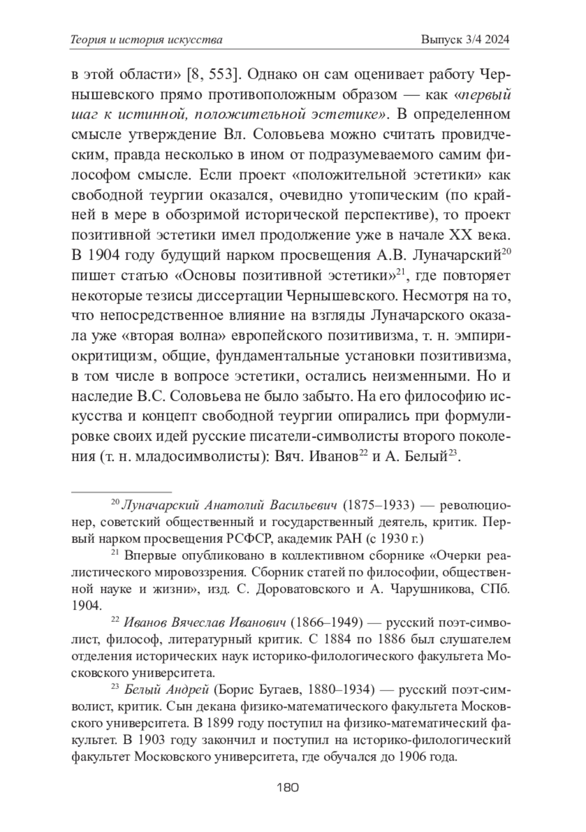Настоящая статья представляет собой обзор двух наиболее значимых эстетических учений, ознаменовавших собой пространство русской эстетической мысли во второй половине XIX столетия. Русская эстетическая мысль этого периода активно нащупывает национальную основу, стремиться осмыслить себя как особую, отличную от западноевропейской, традицию. В этой связи обычно отмечают бурную дискуссию между славянофилами и западниками, — идейными противниками во многих вопросах, в том числе касающихся отечественной эстетики и теории искусства. В этой дискуссии активное участие принимали преподаватели и выпускники Императорского Московского университета. В настоящей статье предлагается взглянуть на историю русской эстетической мысли сквозь призму двух направлений: позитивизма (положительная эстетика) и идеализма. В рамках этой задачи дается обзор преимущественно двух представителей той и другой позиций. С одной стороны, идеи Н. Г. Чернышевского, изложенные в его диссертации «Эстетические отношения искусства к действительности», с другой — взгляды В. С. Соловьева, выпускника и доцента Московского университета, высказанные в нескольких поздних текстах по эстетике конца 80-х — начала 90-х годов XIX века. В статье использовался историко-сравнительный метод. В качестве результата, в статье делается вывод, что, несмотря на ряд внешне очевидных принципиальных идеологических различий, характеризующих оба направления, в отечественной эстетической мысли можно найти примеры их сближения на почве тех целей и задач, которые ставят русские философы перед искусством как социальной практикой. И вместе тем хорошо заметна общая критическая позиция практически всех эстетических направлений второй половины XIX века по отношению к идеализму немецкой философии, столь популярной в России в 1820–1830 гг.