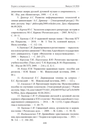 8. Хватова С.И. Дирижирование и регентование - параллельное или встречное движение? // Вестник Адыгейского государственного университета. Серия “Филология и искусствоведение”. - 2009. - Выпуск 2. - С. 265-271. EDN: JNNFKE