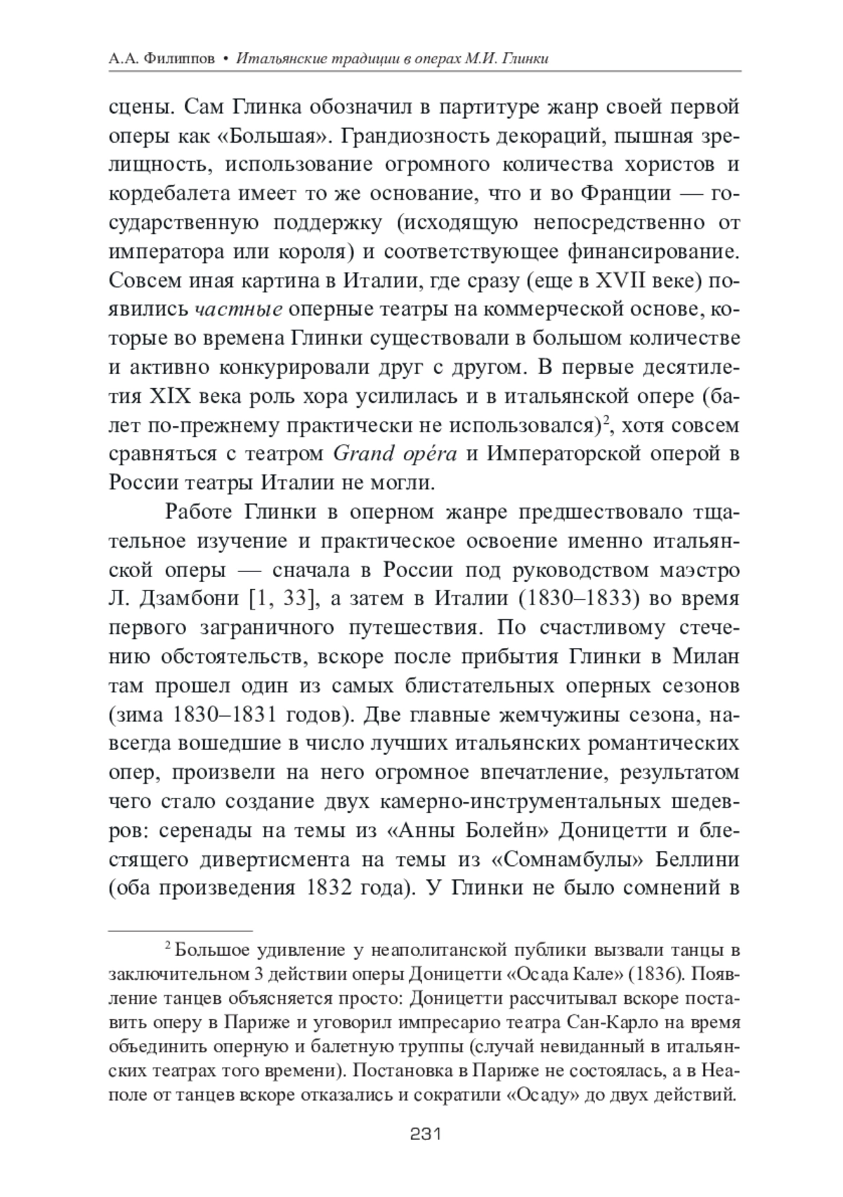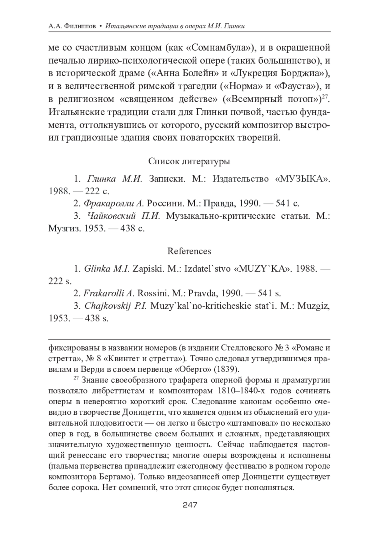 В статье исследуется творческое восприятие Глинкой достижений итальянской романтической оперы 1810–1830-х годов. Отмечено значение пребывания Глинки в Италии и восприятия опер Беллини и Доницетти в общении с авторами и исполнителями. Проанализировано большинство опер Россини, Беллини и Доницетти, отмечены закономерности их драматургии и структуры. Самыми важными для Глинки оказались интродукции и финалы, а также традиционная форма (solita forma) сольных номеров. Подчеркнуто применение канона-кантабиле перед стреттой в финалах первых действий. Показано использование итальянских принципов в сцене Вани из «Жизни за царя» и в трех ариях «Руслана». Новые возможности Глинка нашел в использовании реминисценций. Итальянские традиции стали для Глинки важной опорой, которая помогла композитору выстроить грандиозные здания двух своих новаторских опер
