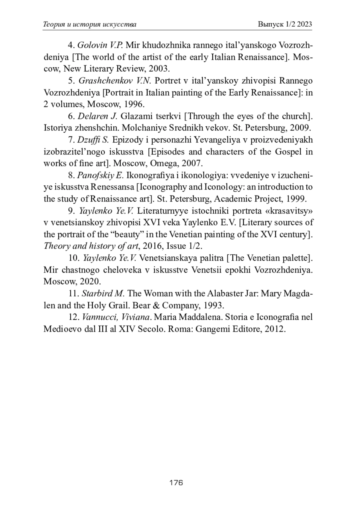 9. Яйленко Е.В. Литературные источники портрета “красавицы” в венецианской живописи XVI века // Теория и история искусства. - 2016. - Вып. 1/2. EDN: DFBVMA