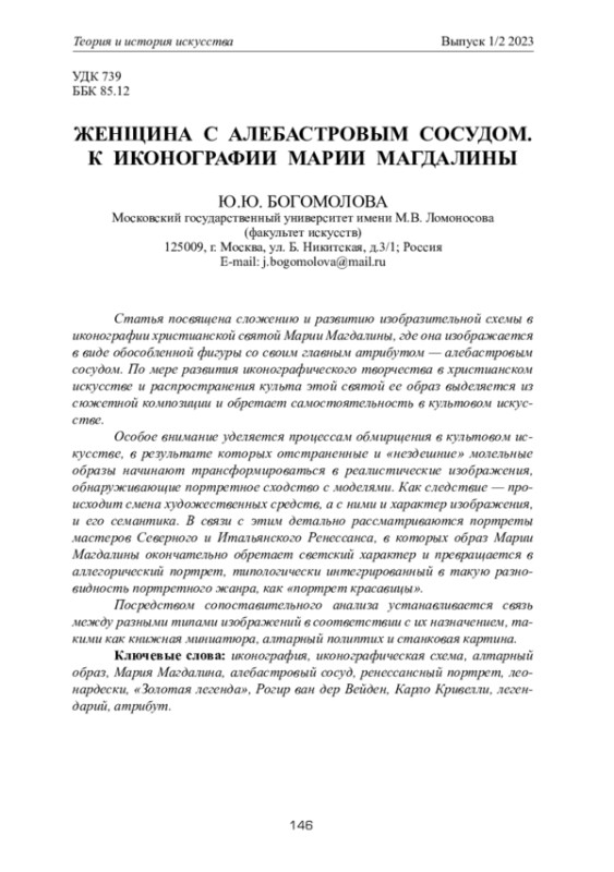 Статья посвящена сложению и развитию изобразительной схемы в иконографии христианской святой Марии Магдалины, где она изображается в виде обособленной фигуры со своим главным атрибутом — алебастровым сосудом. По мере развития иконографического творчества в христианском искусстве и распространения культа этой святой ее образ выделяется из сюжетной композиции и обретает самостоятельность в культовом искусстве. Особое внимание уделяется процессам обмирщения в культовом искусстве, в результате которых отстраненные и «нездешние» молельные образы начинают трансформироваться в реалистические изображения, обнаруживающие портретное сходство с моделями. Как следствие — происходит смена художественных средств, а с ними и характер изображения, и его семантика. В связи с этим детально рассматриваются портреты мастеров Северного и Итальянского Ренессанса, в которых образ Марии Магдалины окончательно обретает светский характер и превращается в аллегорический портрет, типологически интегрированный в такую разновидность портретного жанра, как «портрет красавицы». Посредством сопоставительного анализа устанавливается связь между разными типами изображений в соответствии с их назначением, такими как книжная миниатюра, алтарный полиптих и станковая картина.