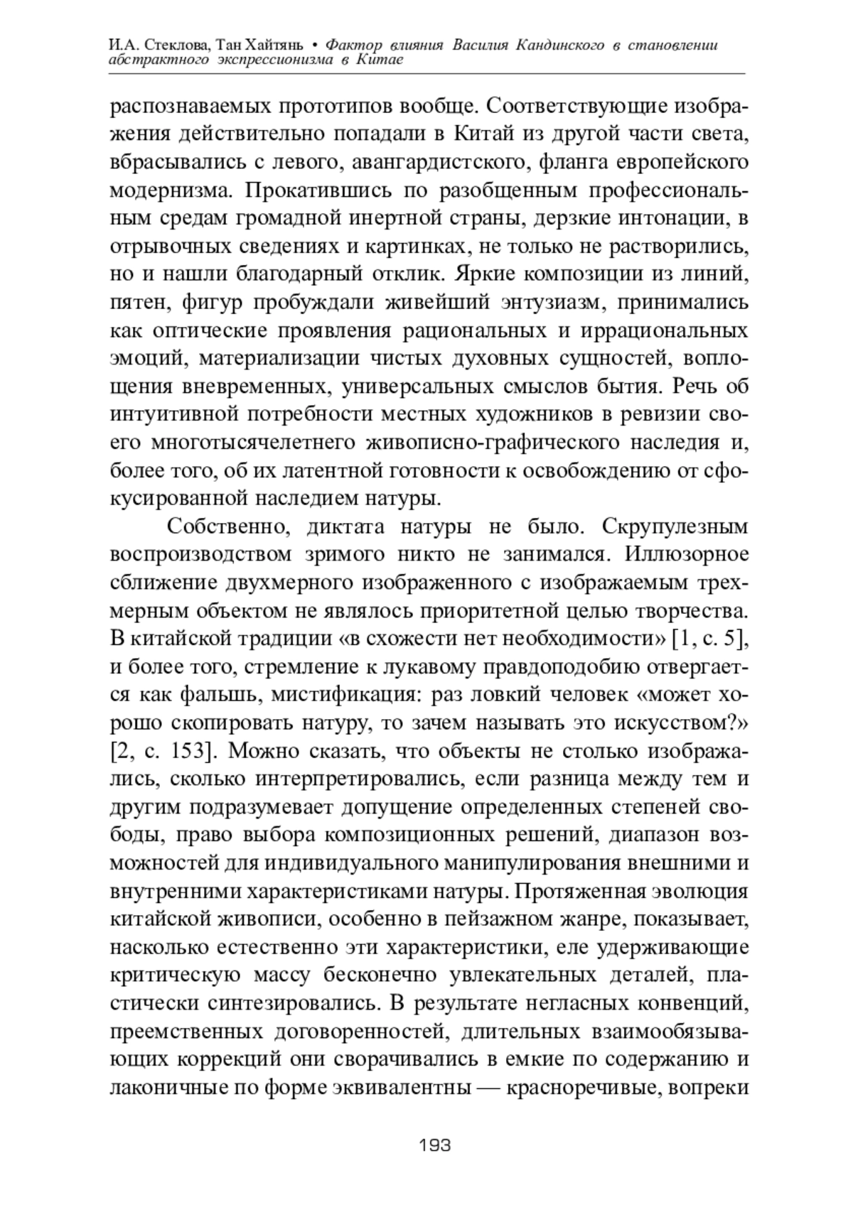Цель настоящей статьи — показать влияние В. В. Кандинского на художественные процессы в Китае XX в. Прослеживается резонанс между восточным эстетико-философским консерватизмом, многовековыми китайскими традициями символического выражения мировоззренческих смыслов и индивидуальных переживаний в пейзажных, натюрмортных, анималистических, сюжетно-бытовых композициях и революционными новациями общепризнанного первооткрывателя западного беспредметного искусства. Феноменом этого парадоксального резонанса и объясняется стремительное распространение в чрезвычайно инертной культурной среде приемов чуждого абстрактного экспрессионизма как самодостаточной системы отвлеченных живописно-пространственных отношений: цветовых, светотональных, линейно-ритмических. Благодаря обаянию новаторской живописи в комплексе с программой оригинальных теоретических положений, творчество В. В. Кандинского выполнило функцию проводника абстракционизма и модернизма. Более того, оно помогло китайским художникам вернуться к национальным первоосновам и показать их ценность миру, перспективность для гуманного человечества XXI в
