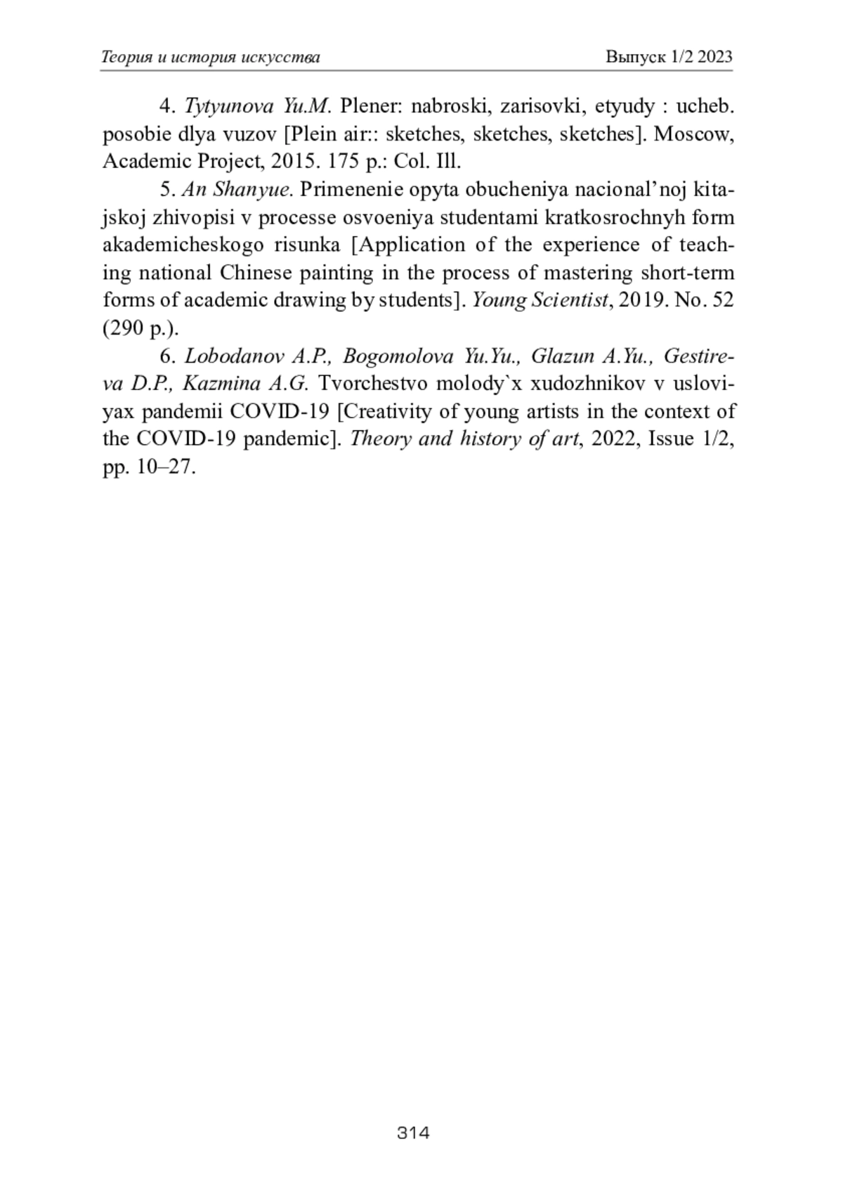 6. Лободанов А.П., Богомолова Ю.Ю., Глазун А.Ю., Жестырёва Д.П., Казьмина А.Г. Творчество молодых художников в условиях пандемии COVID-19 // Теория и история искусства. - 2022. Вып. 1/2. - С. 10-27. EDN: CJLSGE