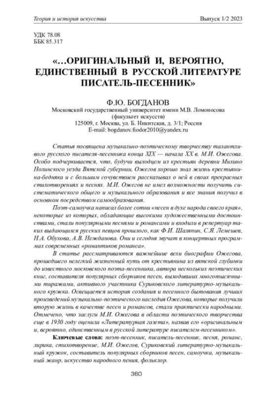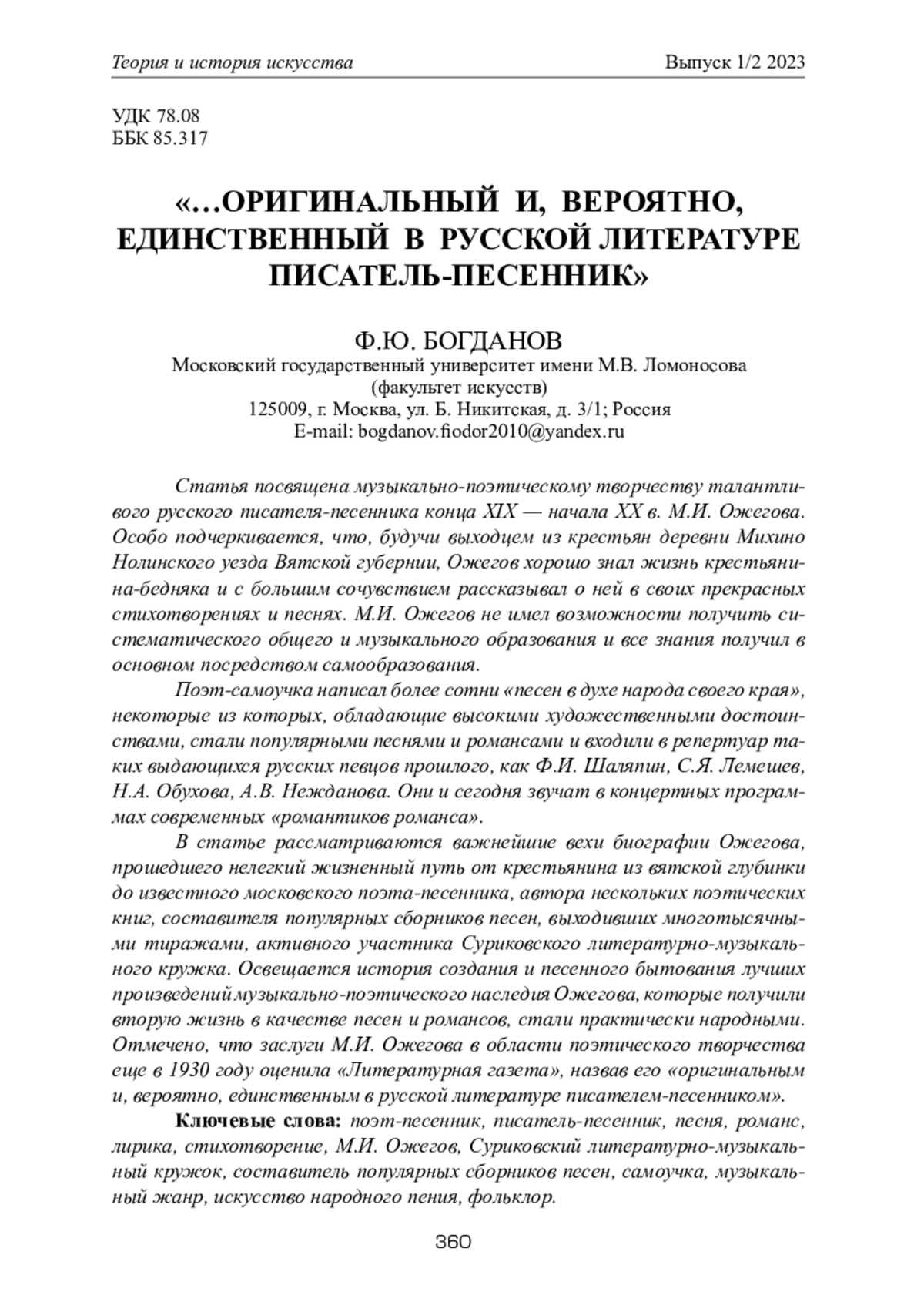 Статья посвящена музыкально-поэтическому творчеству талантливого русского писателя-песенника конца XIX — начала XX в. М. И. Ожегова. Особо подчеркивается, что, будучи выходцем из крестьян деревни Михино Нолинского уезда Вятской губернии, Ожегов хорошо знал жизнь крестьянина-бедняка и с большим сочувствием рассказывал о ней в своих прекрасных стихотворениях и песнях. М. И. Ожегов не имел возможности получить систематического общего и музыкального образования и все знания получил в основном посредством самообразования. Поэт-самоучка написал более сотни «песен в духе народа своего края», некоторые из которых, обладающие высокими художественными достоинствами, стали популярными песнями и романсами и входили в репертуар таких выдающихся русских певцов прошлого, как Ф. И. Шаляпин, С. Я. Лемешев, Н. А. Обухова, А. В. Нежданова. Они и сегодня звучат в концертных программах современных «романтиков романса». В статье рассматриваются важнейшие вехи биографии Ожегова, прошедшего нелегкий жизненный путь от крестьянина из вятской глубинки до известного московского поэта-песенника, автора нескольких поэтических книг, составителя популярных сборников песен, выходивших многотысячными тиражами, активного участника Суриковского литературно-музыкального кружка. Освещается история создания и песенного бытования лучших произведений музыкально-поэтического наследия Ожегова, которые получили вторую жизнь в качестве песен и романсов, стали практически народными. Отмечено, что заслуги М. И. Ожегова в области поэтического творчества еще в 1930 году оценила «Литературная газета», назвав его «оригинальным и, вероятно, единственным в русской литературе писателем-песенником»