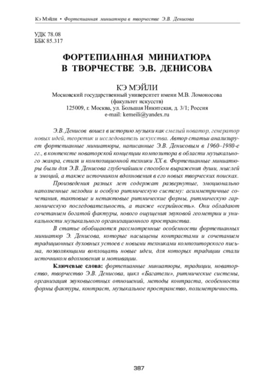 Э. В. Денисов вошел в историю музыки как смелый новатор, генератор новых идей, теоретик и исследователь искусства. Автор статьи анализирует фортепианные миниатюры, написанные Э. В. Денисовым в 1960–1980-е гг., в контексте новаторской концепции композитора в области музыкального жанра, стиля и композиционной техники XX в. Фортепианные миниатюры были для Э. В. Денисова глубочайшим способом выражения души, мыслей и эмоций, а также источником вдохновения в его новых творческих поисках. Произведения разных лет содержат развернутые, эмоционально наполненные мелодии и особую ритмическую систему: асимметричные сочетания, тактовые и нетактовые ритмические формы, ритмическую гармоническую последовательность, а также «серийность». Они обладают сочетанием богатой фактуры, нового ощущения звуковой геометрии и уникальности музыкального организационного пространства. В статье обобщаются рассмотренные особенности фортепианных миниатюр Э. Денисова, которые насыщены контрастами и сочетанием традиционных духовных устоев с новыми техниками композиторского письма, позволяющими воплощать новые идеи, для которых традиции стали источником вдохновения и мотивации