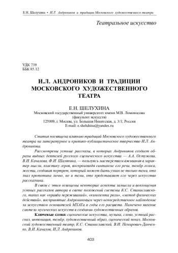 Статья посвящена влиянию традиций Московского художественного театра на литературное и критико-публицистическое творчество И. Л. Андроникова. Рассмотрены устные рассказы, в которых Андроников создает образы видных деятелей русского сценического искусства — А. А. Остужева, В. И. Качалова, Ф. И. Шаляпина, — пользуясь мастерством вживания в характер мысли, пластику героя, воспроизводя синтаксис его речи, тембр голоса, жесты, создавая портрет, который может быть узнан не только теми, кто знал прототипа лично, но и теми, кто представляет его через искусство рассказчика. В связи с этим освещены некоторые аспекты замысла и воплощения устных рассказов автора в свете положений системы К. С. Станиславского, таких как «правда переживаний», «кинолента роли», «метод физических действий», воспринятые Андрониковым через непосредственное наблюдение за искусством основателей МХАТа в годы его расцвета. Намечено явление синтеза мусических искусств в создании художественных образов