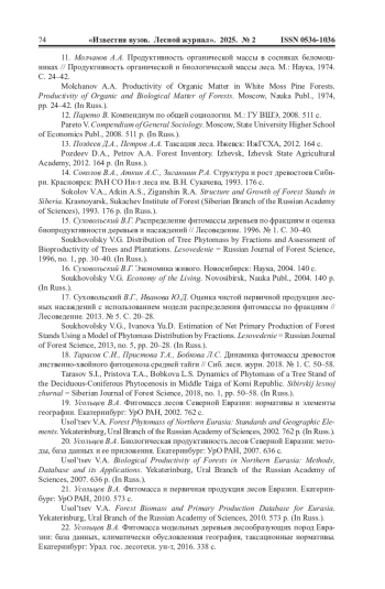 11. Молчанов А.А. Продуктивность органической массы в сосняках беломошниках // Продуктивность органической и биологической массы леса. М.: Наука, 1974. С. 24-42.