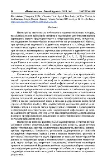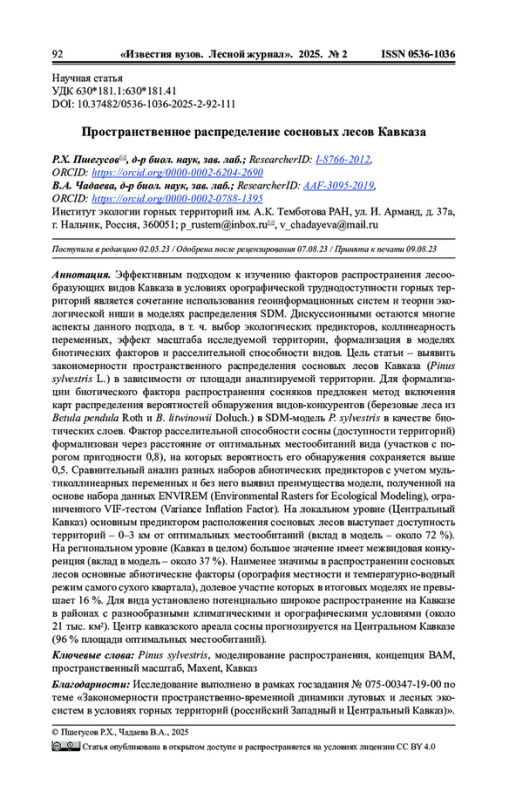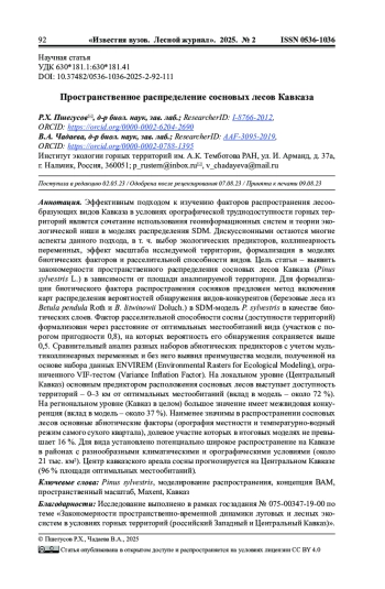 Эффективным подходом к изучению факторов распространения лесообразующих видов Кавказа в условиях орографической труднодоступности горных территорий является сочетание использования геоинформационных систем и теории экологической ниши в моделях распределения SDM. Дискуссионными остаются многие аспекты данного подхода, в т. ч. выбор экологических предикторов, коллинеарность переменных, эффект масштаба исследуемой территории, формализация в моделях биотических факторов и расселительной способности видов. Цель статьи - выявить закономерности пространственного распределения сосновых лесов Кавказа (Pinus sylvestris L.) в зависимости от площади анализируемой территории. Для формализации биотического фактора распространения сосняков предложен метод включения карт распределения вероятностей обнаружения видов-конкурентов (березовые леса из Betula pendula Roth и B. litwinowii Doluch.) в SDM-модель P. sylvestris в качестве биотических слоев. Фактор расселительной способности сосны (доступности территорий) формализован через расстояние от оптимальных местообитаний вида (участков с порогом пригодности 0,8), на которых вероятность его обнаружения сохраняется выше 0,5. Сравнительный анализ разных наборов абиотических предикторов с учетом мультиколлинеарных переменных и без него выявил преимущества модели, полученной на основе набора данных ENVIREM (Environmental Rasters for Ecological Modeling), ограниченного VIF-тестом (Variance Inflation Factor). На локальном уровне (Центральный Кавказ) основным предиктором расположения сосновых лесов выступает доступность территорий - 0-3 км от оптимальных местообитаний (вклад в модель - около 72 %). На региональном уровне (Кавказ в целом) большое значение имеет межвидовая конкуренция (вклад в модель - около 37 %). Наименее значимы в распространении сосновых лесов основные абиотические факторы (орография местности и температурно-водный режим самого сухого квартала), долевое участие которых в итоговых моделях не превышает 16 %. Для вида установлено потенциально широкое распространение на Кавказе в районах с разнообразными климатическими и орографическими условиями (около 21 тыс. км2). Центр кавказского ареала сосны прогнозируется на Центральном Кавказе (96 % площади оптимальных местообитаний).