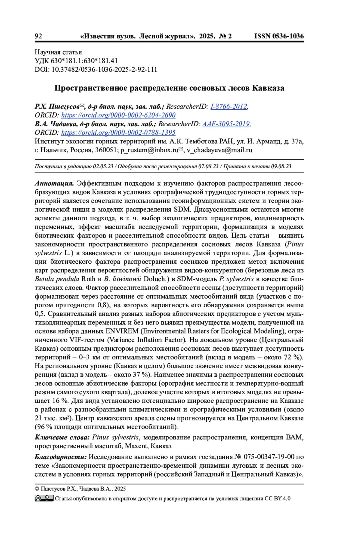 35. Pshegusov R., Tembotova F., Chadaeva V., Sablirova Y., Mollaeva M., Akhomgotov A. Ecological Niche Modeling of the Main Forest-Forming Species in the Caucasus. Forest Ecosystems, 2022, vol. 9, art. no. 100019. DOI: 10.1016/j.fecs.2022.100019 EDN: IELQNZ