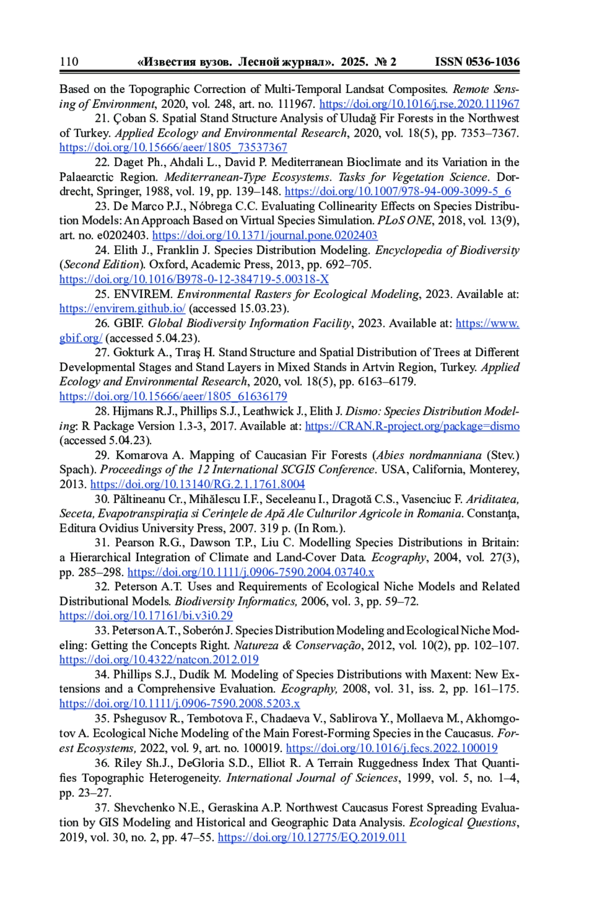 40. Title P.O., Bemmels J.B. ENVIREM: An Expanded Set of Bioclimatic and Topographic Variables Increases Flexibility and Improves Performance of Ecological Niche Modeling. Ecography, 2018, vol. 41, iss. 2, pp. 291-307. DOI: 10.1101/075200