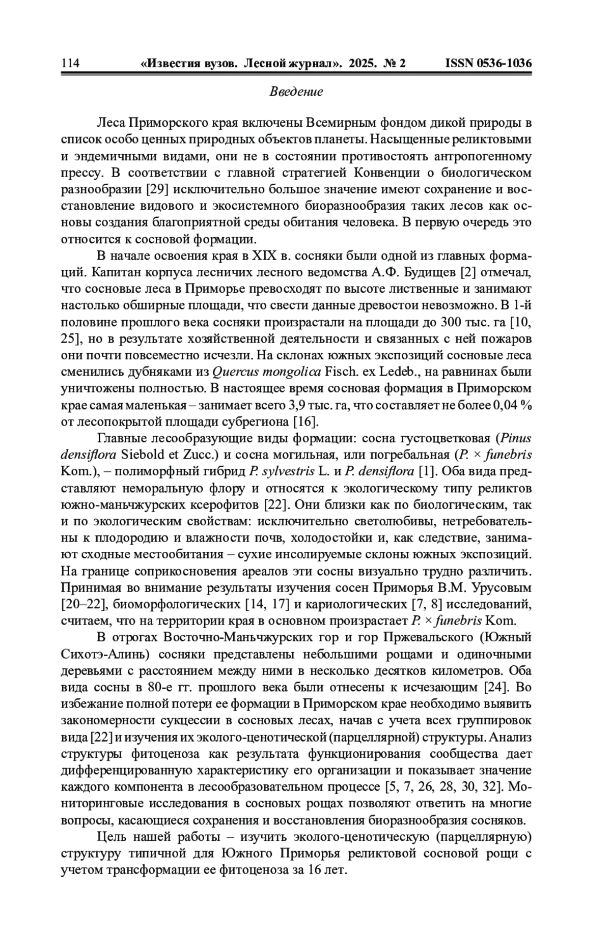 Леса Приморского края включены Всемирным фондом дикой природы в список особо ценных природных объектов планеты. Насыщенные реликтовыми и эндемичными видами, они не в состоянии противостоять антропогенному прессу. В соответствии с главной стратегией Конвенции о биологическом разнообразии [29] исключительно большое значение имеют сохранение и восстановление видового и экосистемного биоразнообразия таких лесов как основы создания благоприятной среды обитания человека. В первую очередь это относится к сосновой формации.