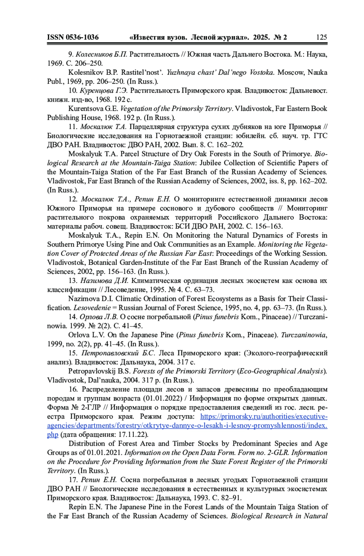 12. Москалюк Т.А., Репин Е.Н. О мониторинге естественной динамики лесов Южного Приморья на примере соснового и дубового сообществ // Мониторинг растительного покрова охраняемых территорий Российского Дальнего Востока: материалы рабоч. совещ. Владивосток: БСИ ДВО РАН, 2002. С. 156-163.