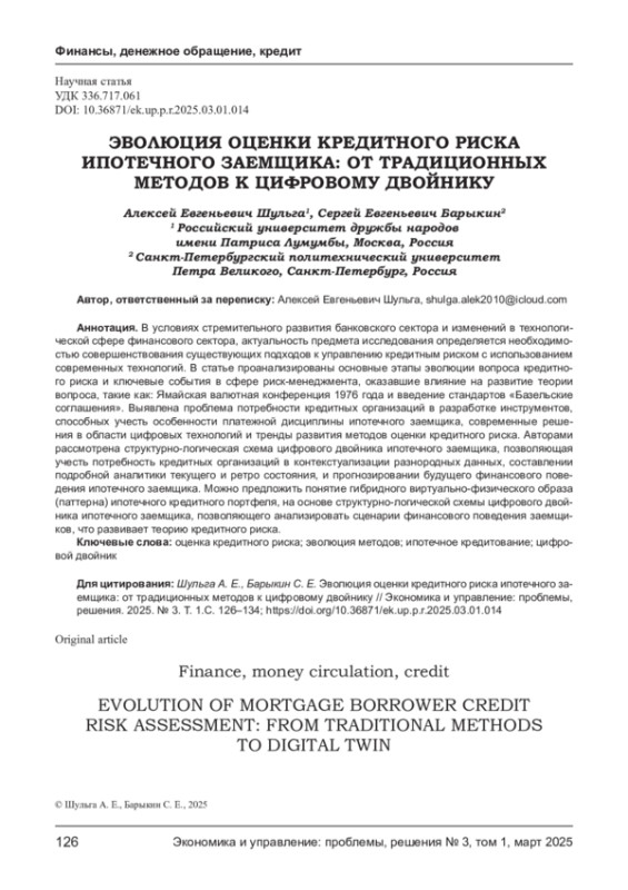 В условиях стремительного развития банковского сектора и изменений в технологической сфере финансового сектора, актуальность предмета исследования определяется необходимостью совершенствования существующих подходов к управлению кредитным риском с использованием современных технологий. В статье проанализированы основные этапы эволюции вопроса кредитного риска и ключевые события в сфере риск-менеджмента, оказавшие влияние на развитие теории вопроса, такие как: Ямайская валютная конференция 1976 года и введение стандартов «Базельские соглашения». Выявлена проблема потребности кредитных организаций в разработке инструментов, способных учесть особенности платежной дисциплины ипотечного заемщика, современные решения в области цифровых технологий и тренды развития методов оценки кредитного риска. Авторами рассмотрена структурно-логическая схема цифрового двойника ипотечного заемщика, позволяющая учесть потребность кредитных организаций в контекстуализации разнородных данных, составлении подробной аналитики текущего и ретро состояния, и прогнозировании будущего финансового поведения ипотечного заемщика. Можно предложить понятие гибридного виртуально-физического образа (паттерна) ипотечного кредитного портфеля, на основе структурно-логической схемы цифрового двойника ипотечного заемщика, позволяющего анализировать сценарии финансового поведения заемщиков, что развивает теорию кредитного риска.