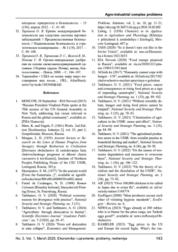 13. Тарханов О. В. Цены на пищу. Причина и следствия или рост цен на пищу - признак движения к катастрофе // Национальная безопасность и стратегическое планирование. - № 1 (33), 2021. - С. 89-102. EDN: KWJIGM