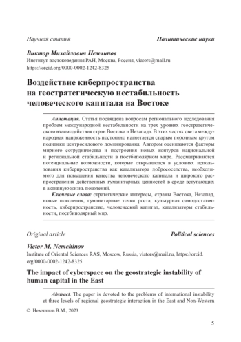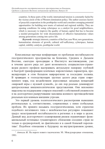 Статья посвящена вопросам регионального исследования проблем международной нестабильности на трех уровнях геостратегического взаимодействия стран Востока и Незапада. В этих частях света международная напряженность постоянно нагнетается старым порочным кругом политики центросилового доминирования. Автором оцениваются факторы мирного сотрудничества и построения новых контуров национальной и региональной стабильности в постбиполярном мире. Рассматриваются потенциальные возможности, которые открываются в условиях использования киберпространства как катализатора добрососедства, необходимого для повышения качества человеческого капитала и широкого распространения действенных гуманитарных ценностей в среде вступающих в активную жизнь поколений.
