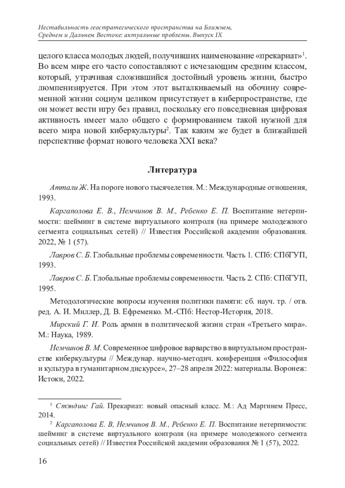 10. Немчинов В. М. Пространственные, временные, соматические и духовные границы, рассматриваемые как виртуальное отражение расширяющейся личностной самости // МЕТЕКСИС (на англ. яз.). Яссы, 2022. Т. 2, № 1 Стэндинг Гай. Прекариат: новый опасный класс. М.: Ад Маргинем Пресс, 2014.