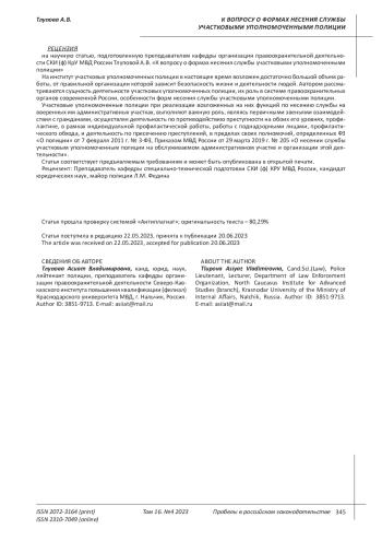 12. Шоров Р.З., Васильев А.М. О роли участковых уполномоченных полиции // Международный журнал гуманитарных и естественных наук. 2020. № 11. С. 152-154. EDN: QPCGYL