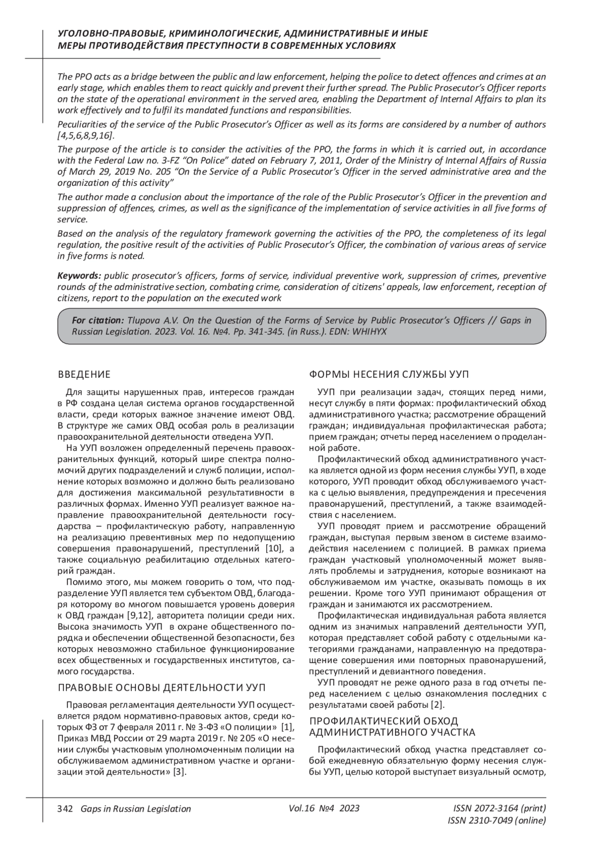 Участковые уполномоченные полиции (далее - УУП) играют важную роль в жизни общества и государства. Они являются тем звеном в системе охраны общественного порядка и органов внутренних дел, которое тесно взаимодействует с населением в ходе осуществления своей служебной деятельности на обслуживаемых административных участках. УУП обеспечивают безопасность территории обслуживаемого участка, осуществляют профилактическую работу, принимают меры по предотвращению, выявлению и пресечению правонарушений, преступлений. УУП выступает своеобразным мостом между населением и правоохранительными органами, помогая полиции выявлять правонарушения и преступления на ранней стадии, что дает возможность быстро реагировать на них, предотвращать их дальнейшее распространение. УУП сигнализируют о том, в каком состоянии находится оперативная обстановка на обслуживаемых ими участках, что позволяет ОВД эффективно планировать свою работу и выполнять возложенные на них функции и обязанности. Особенности несения службы УУП, а также ее формы, рассмотрены рядом авторов [4,5,6,8,9,16]. Целью написания исследовательской работы является рассмотрение деятельности УУП, того в каких формах она осуществляется, согласно ФЗ от 7 февраля 2011 г. № 3-ФЗ «О полиции», Приказу МВД России от 29 марта 2019 г. № 205 «О несении службы участковым уполномоченным полиции на обслуживаемом административном участке и организации этой деятельности». Автором сделан вывод о важности роли деятельности УУП в предупреждении и пресечении правонарушений, преступлений, а также о важности реализации служебной деятельности во всех пяти формах несения службы. На основе анализа нормативной базы, регулирующей деятельность УУП, отмечается, полнота ее правовой регламентации, положительный результат деятельности участковых уполномоченных, сочетание различных направлений несения службы в пяти формах.