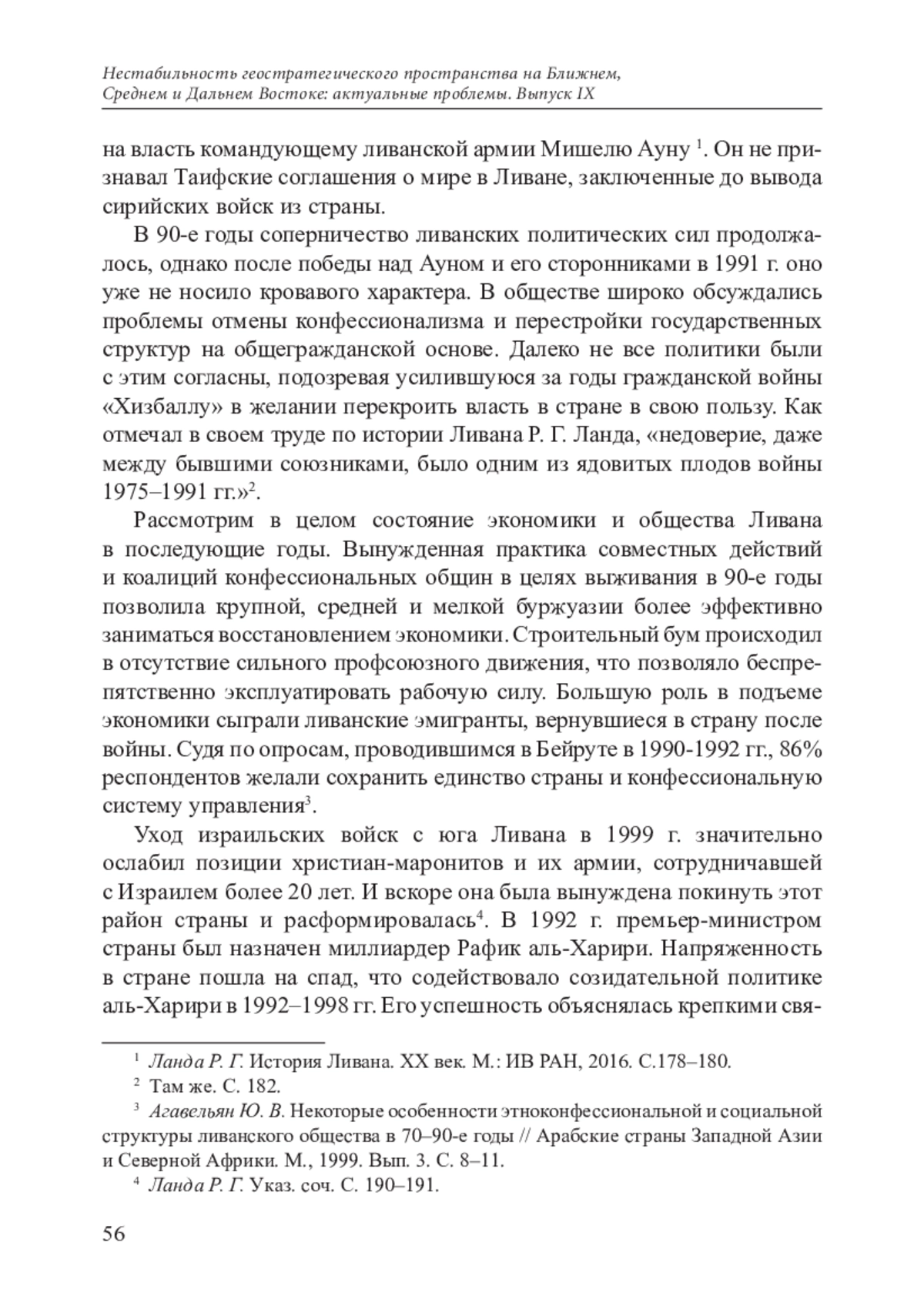 4. Горбунова Н. М. Ливанский кризис: трансформация общества и государства // Восток-Oriens. 2013. № 4. Ланда Р. Г. История Ливана. ХХ век. М.: ИВ РАН. 2016. EDN: RESGEF