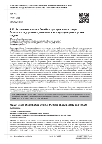 Целью данного исследования является изучение проблемных вопросов борьбы с преступностью в сфере безопасности дорожного движения и эксплуатации транспортных средств. В законодательстве предусмотрено ужесточение уголовной ответственности за преступления, направленные против безопасности на дороге и безопасных условий эксплуатации транспортных средств. В настоящий момент по таким деяниям предусмотрен максимальный срок лишения свободы до 4 лет. В случае смерти одного человека, наступившей по причине дорожно-транспортного происшествия с участием водителя в состоянии опьянения, мера ответственности составит 5-12 лет, тогда как действующий закон определяет максимальный срок 7 годами. При летальном исходе для 2 человек и более в подобной же ситуации водитель может оказаться в тюрьме на срок от 8 до 15 лет, тогда как действующее законодательство ограничивает его 4-9 годами. Помимо прочего, ожидается ужесточение наказаний за такие же деяния, совершенные на других видах транспорта, от метрополитена до авиации. Действие ст. 263 УК РФ будет затрагивать и лиц, управляющих воздушными судами, вплоть до сверхлегких, и маломерным водным транспортом. Ожидается и увеличение ответственности за подобные нарушения, которая будет соответствовать подобным деяниям в отношении дорожно-транспортного происшествия, виновник которых находился в состоянии опьянения. Также к сфере тяжких преступных деяний предполагается отнести действия, совершенные по неосторожности, за которые будут назначать до 15 лет тюремного заключения. В данный момент эта норма уже введена в действие. Касательно преступлений изучаемой категории очень важно установить прямую причинно-следственную связь между нарушением и последствиями, которые оно вызвало, однако относительно правил эксплуатации транспортных средств это куда сложнее реализовать, чем в части соблюдения норм правил дорожного движения