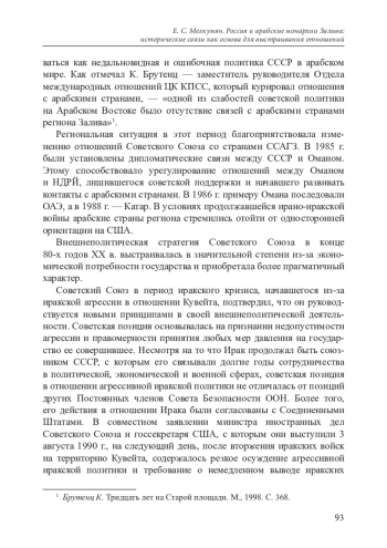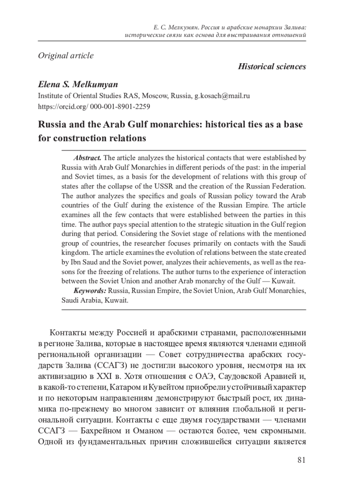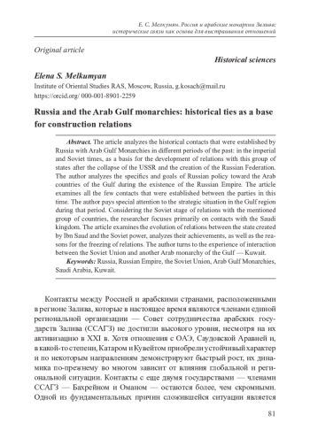 В статье анализируются исторические контакты, которые были установлены Россией с арабскими монархиями Залива в различные периоды прошлого: в имперское и советское время, как основы для развития отношений с этой группой государств после распада СССР и создания Российской Федерации. Автор исследует особенности и цели российской политики в отношении арабских стран Залива в период существования Российской империи. В статье рассматриваются все те немногочисленные контакты, которые были установлены между сторонами в тот период. Автор обращает особое внимание на стратегическую ситуацию, складывавшуюся в регионе Залива в тот период. Рассматривая советский этап развития отношений с указанной группой стран, исследователь акцентирует внимание, прежде всего, на контактах с саудовским королевством. В статье рассматривается эволюция отношений между государством, созданным Ибн Саудом и советской державой, анализируются их достижения, а также причины замораживания отношений. Автор обращается к опыту взаимодействия Советского Союза с еще одной арабской монархией Залива — Кувейта.